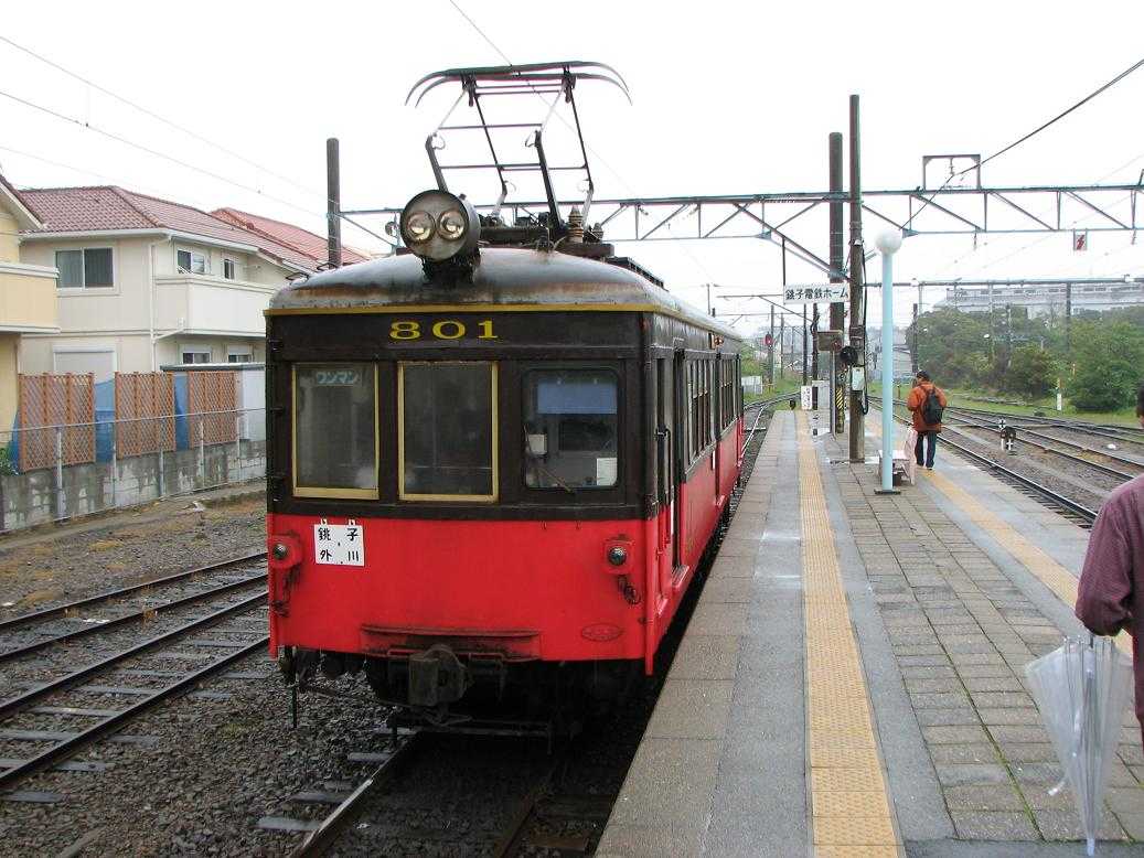 銚子電鉄:デハ801銚子電鉄800形は、昭和25年に製造された元伊予鉄道の電車で、昭和60年に譲渡を受け、銚子電鉄に入線しています。デハ801は、伊予鉄道時代に片運化、さらに両運化改造されたということで、運転台の形状が銚子寄り、外川寄りで大きく異なります。※撮影は、平成20年5月3日です。銚子駅にてこの日はデハ801が運用に入っていました。犬吠駅ホームからこの日はGWでもあったため犬吠埼への観光客が多く、団体のバス利用者が圧倒的に多いですが、銚子電鉄の利用者もかなり多くありました。特に、例のぬれせんべいの件もあったためか、駅ではお布施の如く入場券や名産品などを買い求める客が多く、ごった返していました。そんな中、我々の乗るデハ801は車体も小さいため、埼京線並みのラッシュ状態でした。銚子~中ノ町間にて中ノ町車庫からの帰途、次の電車ではJRの接続が間に合わなくなるため、駅間を走りました。途中で乗って来た電車が折り返して来たために撮ることが出来たショット。特に車両の知識がなかったので、前後で違う顔だということを知りませんでしたが、結果的に駅間をダッシュしたことで両サイドの写真を撮ることが出来ました。デハ801も700形の2両と同様に、平成22年に廃車となっています。廃車後は終端の外川駅に保存されていましたが、写真を見る限り状態は良くないようです。その後はどうなったでしょうか?