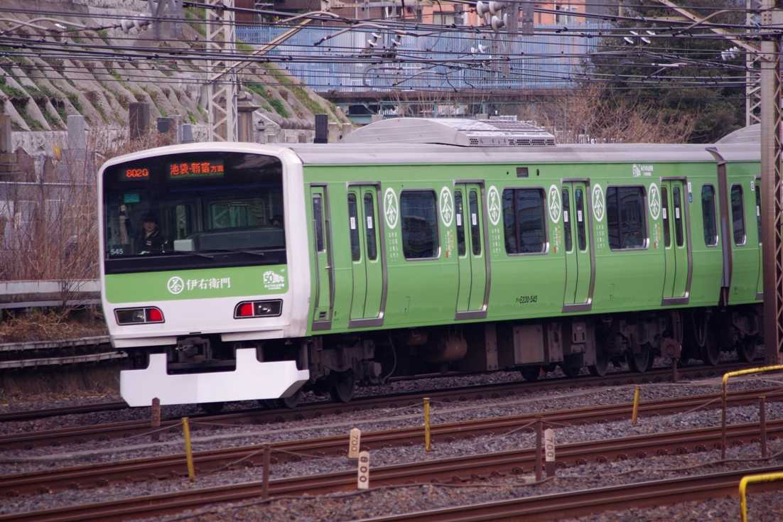 E231系:みどりの山手線(伊右衛門)前回の50thヘッドマーク付の後、広告ラッピングが施されました。その第1弾が「伊右衛門」です。運転期間は、平成25年2月18日から3月17日の4週間で、ADトレインと合わせて設定されています。平成25年3月10日 日暮里駅付近にてダイヤ改正前、日暮里駅で写真を撮っているときに偶然通り掛かったもの。狙っていたわけではないのでしょーもないアングルなのはご愛嬌です。お茶なので緑色を利用してイメージそのまま行けるという発想でしょうが、当時のコメントとしても「個人的には、何だかそういう発想そのものが下品に見えてしまうんですけど。」といった内容が残されています。「せっかくの50周年はどこへ?」とも。