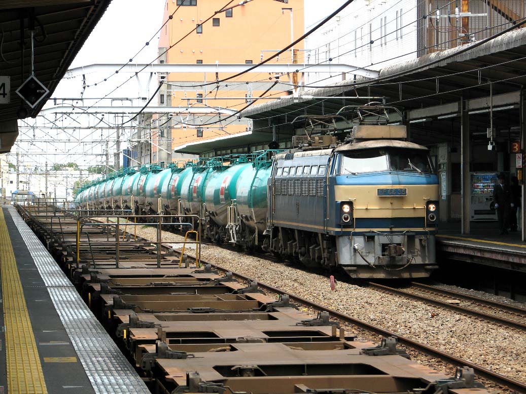 国鉄 直流型電気機関車:EF6635EF66シリーズで、35号機です。平成22年5月18日 西国分寺駅にて現場仕事のお昼の移動途中、空いた時間を利用して西国分寺駅に寄った時のものです。列車ダイヤを全く知らなかったのですが、着いてすぐに接近放送が入り「ラッキー」。と思ったのも束の間、無情にも手前番線に接近放送が・・・完全にカブられてしまいました。でも、反対から現れたEF66が見えます・・・隠れません。なんと、手前の列車は長大編成ながらも、コンテナが1個も載っていなかったのです。だから、フツーにEF66の牽引するタンカー列車が撮れてしまいました。この列車が来ることも、このスジがEF66であることも、タンカー列車であることも、カブられることも、手前の列車がカラだったことも、すべての偶然が重なった不思議な絵になりました。35号機は、2013年度に除籍になったそうです。