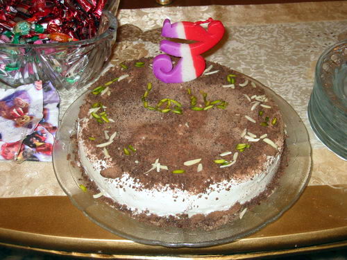 こちらがケーキのアップ。ペルシャ語でTAHAと書いてあるのがおわかりになかしら?アラビア語だとテインとへ ドチェシュメの上にそれぞれ たてに長母音のアーをあらわす記号がつくのですがイランではこのようにテイン、アレフ、へ、アレフ 、、、、ターハーと書きます。