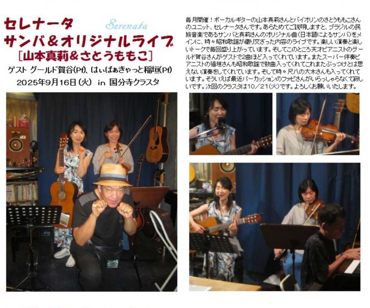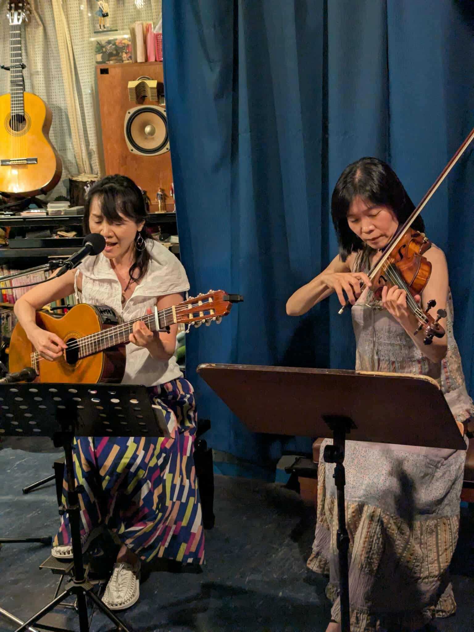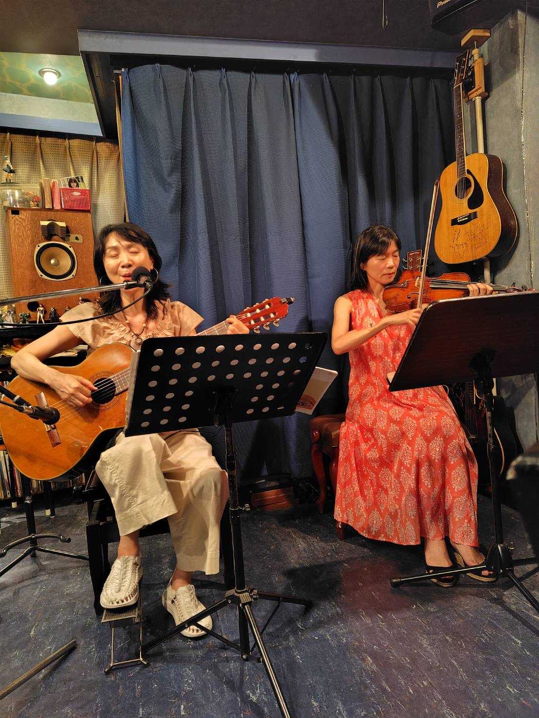 2連チャン2日目!8/21(木)国分寺 クラスタ セレナータライブあっつい中をいらしてくださった皆さま、田中マスター、どうもありがとうございました!前日ソロライブからのセレナータだったこともあり、ももちゃんと音を出すことがとにかく楽しくて🎵セカンドは夏の夜のイメージで選曲したのですが、なんとも濃ゆくなりました。。「Luar」はやっぱりももちゃんのバヨリンがないと🎻2ステージそれぞれの頭が「Samanbaia」「Rio de Janeiro」と、キーが同じで構成がなんとなく似ている2曲だったことに気づいた方はいたかな?どちらも大好きでやりたいけど、同じステージだと、あれ?ってなるし、何より自分が混乱するので😅写真(うめさん、ありがとうございました!)はたぶん「Edge of the Night」。ワタシがガン見しているのは当日書き変えた歌詞。終わった瞬間ももちゃんが「歌詞が!歌詞が!!びっくりした!」…ごめんね。言うの忘れてた😓アンコールはもはやお約束、賀谷さんにピアノで加わっていただき大騒ぎ。楽しかったなあ。賀谷さん、ありがとうございました!次回は9/16(火)です!よろしくお願いいたします😃