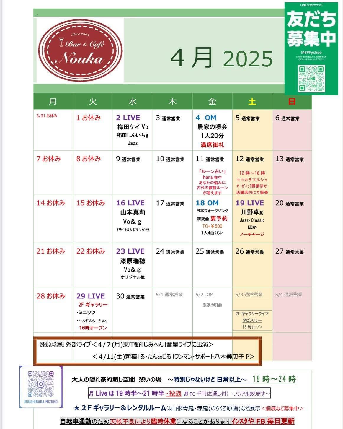 4/16(水)牛浜 Nouka毎月第三水曜日はNoukaで完全生ライブ🎵美味しいお酒とお通し、誰かが頼むと芋づる式に食べたくなるお料理🍴和やかな雰囲気の中、アコースティックな響きをお楽しみください😊お待ちしてます😃