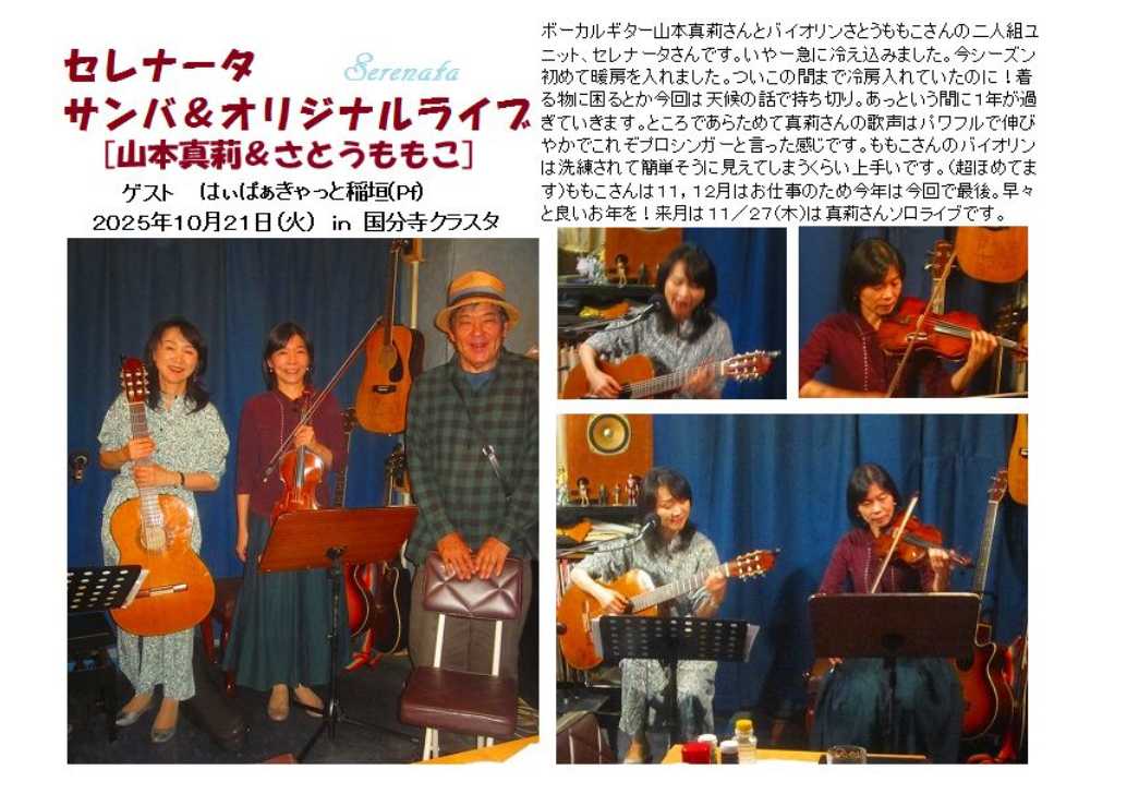 10/21(火)国分寺 クラスタ毎月お世話になっているクラスタ♪ヴァイオリンももちゃんが残念なことに11月、12月はスケジュールが合わないため、セレナータでのクラスタライブは今回が年内ラストとなります。ガーン。ワタシのソロも負けずに楽しくおとどけしたいと思いますが、やはりセレナータの音を聴いていただきたい!皆さま、ぜひぜひよろしくお願いいたします!少し早めの19時スタートです。