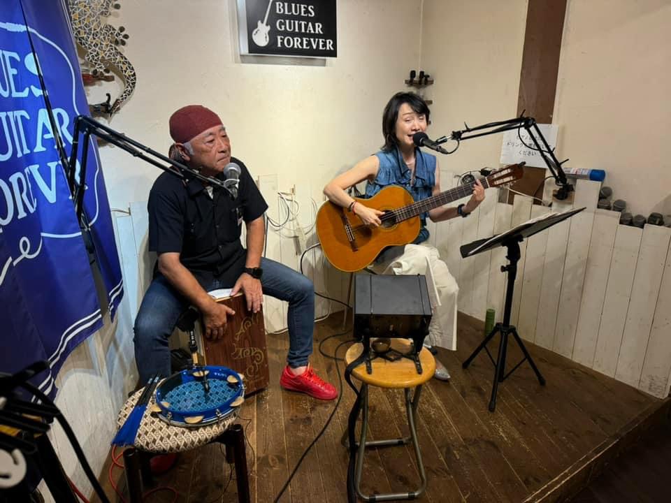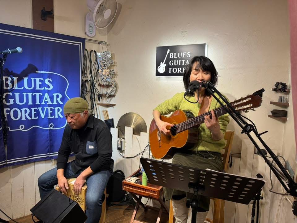 10/24(木)BLUES GUITAR FOREVERパーカッションのファビさんと🎵いらしてくださった皆さま、KINGさんはじめお店の皆さま、どうもありがとうございました!秋っぽい曲を…と思ったら、暑さが戻ってきちゃったこの日、明るめ&夜空のイメージでおおくりしました(先日見た月が大きくてキレイだったので🌖)ファビさん、パンデイロからガンザからカホンまで曲調に合わせて色とりどりの音とグルーヴをありがとうございました😊次回は1/9(木)に決まりました。よろしくお願いいたします!まかないはオムライス😍美味しかった〜!しっかりご飯を食べにいきたいなあ。ノンアルコールワイン🍷も美味しくて嬉しい🎵KINGさん、写真お借りしました!