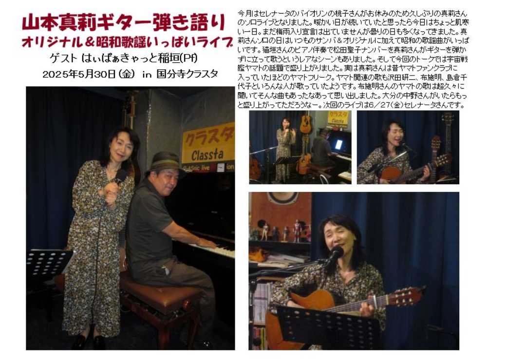 5/30(金)国分寺クラスタ 雨が降ったり止んだり、肌寒いお天気の中をいらしてくだった皆さま、田中マスター、どうもありがとうございました!久方ぶりのソロ。明るめ、雨の曲に続いて、今回の昭和歌謡はシュミに走らせていただきました😅地味だけどきれいな曲。どちらもお初のアコースティック時代のアルフィーと宇宙戦艦ヤマトの主題歌「愛よその日まで」←田中マスターさすが!ご存知でした。挿入歌「別離」←これは…知ってる人はいるかな?そしてねこがきさんにピアノをお願いして聖子ちゃん集。あの頃は…と昭和話に花が咲くインターバル。あ、天地真理も歌いました。ねこがきさん、ぶっつけにもほどがあるお願いにお応えいただき素敵なピアノをどうもありがとうございました!次回クラスタは6/27(金)セレナータでのライブです😃