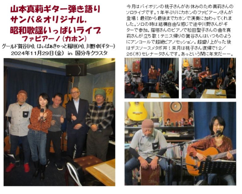 これからのライブです😃朝の匂いが冬っぽくなってきました。いつもお世話になっているお店に加えてスペシャルも✨あたたかいひとときをおとどけしたいと思います。よろしくお願いいたします!⭐️11/16(土)海老名中央公園 Music Fes 秋の祭典II ソロで参加します⭐️11/20(水)牛浜 Nouka 完全生音ソロライブ ⭐️11/29(金)国分寺 Classta ソロ⭐️12/4(水)六本木 Nochero ソロ⭐️12/18(水)牛浜 Nouka 完全生音ソロライブ ⭐️12/21(土)横浜 Hey-JOE 再開記念ライブ♪ 〜Serenata 〜Bossa Nova × Japão 山本真莉(vo,gt)さとうももこ(violin) guest:大木醒山(尺八)⭐️12/26(木)国分寺 Classta Serenata!