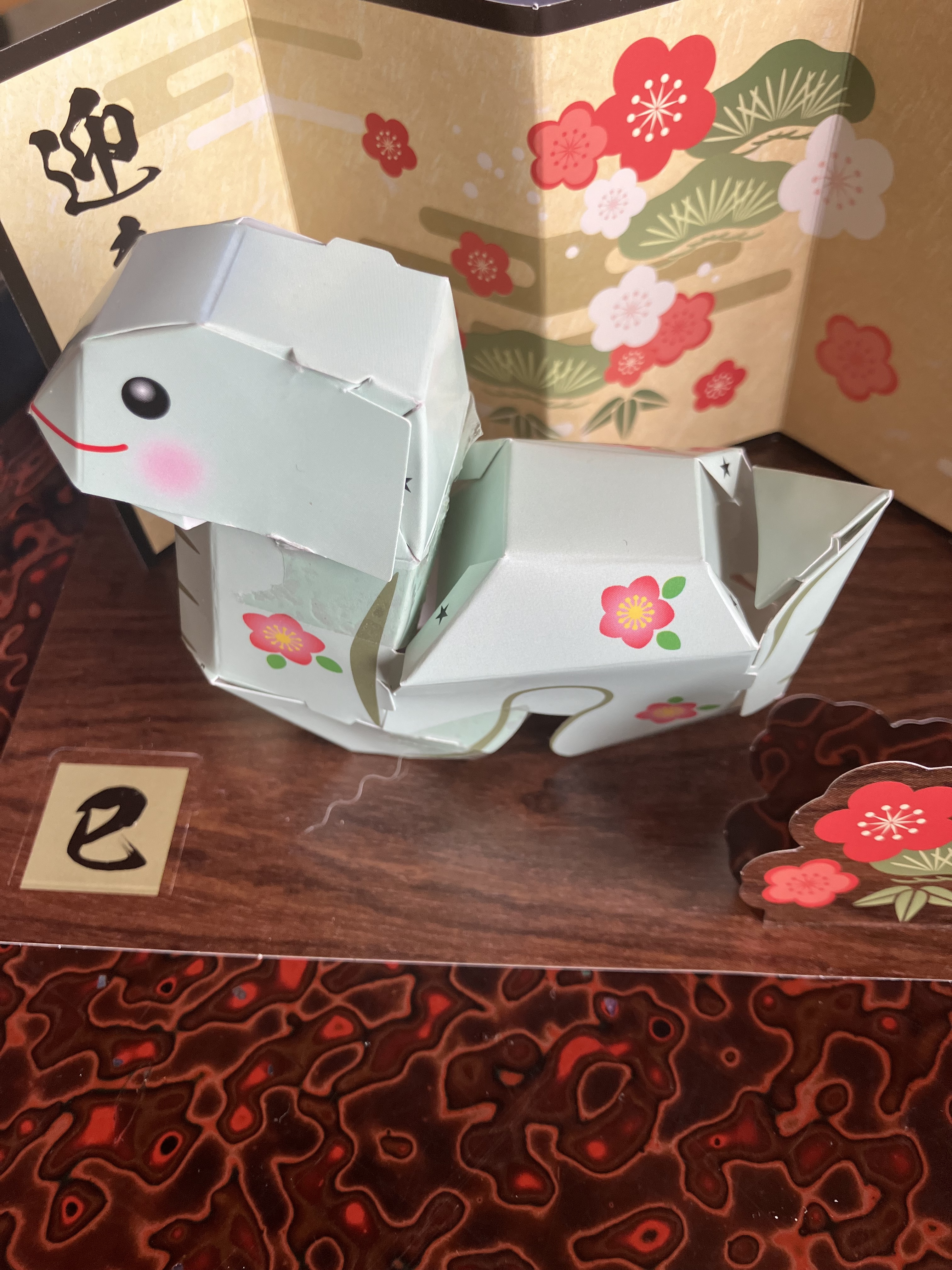 えがおの黒酢を購入しているのですがオマケに蛇のペーパークラフトが送られてきましたわたしはこういうの上手に作れないので夫にさせようと思っていたのですがうっかり忘れて夫は仕事に行ってしまって当分してくれそうにないので仕方なく自分で作りましたがひどい出来ですそれはともかくこの蛇って足があって尾も蛇らしくなくてなんかおかしいです今年の干支ですがあまりリアルに作ると嫌がられるので可愛く作りすぎてこれって何???ていうような置物も多いです