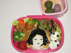 「毛利さんのお弁当にして」 と週末から言われていたので今日は元就さん弁当に。。。 (あ。今週から給食が始まったのでお弁当が火曜木曜だけになったんですよ!) うん。ちょっと失敗した。 愛の力だけではどうにもならなかった。 海苔だけだとご飯にペターっとくっついちゃって 髪の毛の質感が出せないので いつもはハムと海苔を重ねて髪の毛を作るんだけど、 今日に限ってハムがなく。。。 薄焼き卵で代用したら熱の所為か脂分の所為か海苔が縮んだ。。orz ちょっと毛先が金髪になっちゃったよww。元就さん。 本当はハムじゃなくてスライスチーズを土台にすると扱いやすいんだけど、いかんせんレヴィがチーズ嫌いなもので。。 いや、私もチーズは嫌いじゃないけど、ご飯の上にチーズってどうよ。って思ってなかなか使えないんだよね。 見た目重視で何でもありのキャラ弁は嫌なんだよね。要は味でしょ? でもそーすると素材が限られるから苦労する。 なーんて、言い訳ですが。 右端のうずら卵で作った毛利軍の駒はお気に入りですwww デザートは瀬戸内カラーの白玉団子。 緑はほうれん草パウダー、紫は紫芋パウダーを練りこんでます。 でもキャラ弁にするとついつい隙間埋めるために詰め込んじゃうから 残して帰ってくるんだよなー。。 食べさせるために工夫してるのに本末転倒wwwwww
