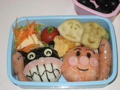 クラスのお友達に好評なんだそうだ。>お弁当 アンパンマンとバイキンマン 人参とリンゴのサラダが好評だったけど、 レヴィが1番好きなのはキュウリを3cmくらいの輪切りにしたのに 切り込みいれて、塩と味の素を振っただけの浅漬けなのでした。。。 これ、やっべ、ご飯入れすぎた!!って思ったんだけど 全部食べてきたー。。 真ん中の色の悪い物体は春巻きです。。。 ノーマルの中華春巻きとキャベツとささ身のカレーマヨネーズ春巻き。 ハートのポテトの下は鶏肉のハンバーグ・オーロラソース添えですー。