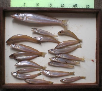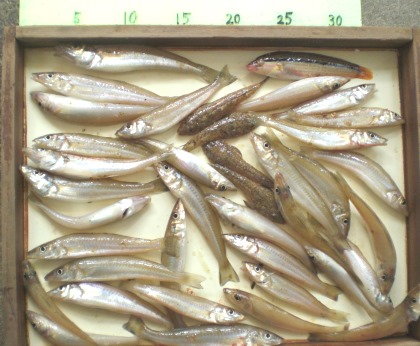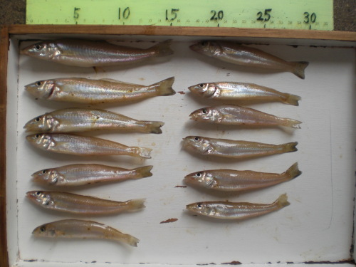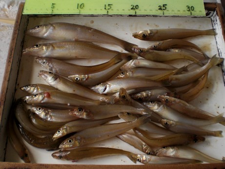 おはようございます。8月4日の日記です。土曜、日曜も雨模様で今日も曇天の天候です。私としては野菜の水やりから解放されて楽ですがね。では、昨日の釣果です。トップは須磨の増田様朝からアジ釣りです。アジのサイズも15センチと豆アジの種類が違ってました。サバも成長してましたね。残念なのは途中でボラがアジを追いかけて釣れなくなったと仰ってました。続いて伊丹の盛重様、薮内様事前から準備をしてガシラを主に須磨に来られました。18センチを頭に本命をゲットされました。笑顔のまぶしい好青年です。餌はシラサ、虫を使用されました。そして垂水のS様。キス釣り名人のお一人です。メッセージを頂いてますのでご紹介します****************************************今日はありがとうございました朝5時半前に釣り場に着き早速準備して釣り開始、9時頃から小雨がパラパラと降ったり止んだりする中、お昼前まで釣りました釣果はキス最大1cmまでを18匹、赤ベラ1匹でした昨日の雨の影響か少し水が濁り気味で食いが悪いのかアタリも小さかったです最後は釣りではありませんが釣り人に取って貴重な情報を大阪の前川さんから頂きましたのでご紹介します******************************************大阪の前川です。3日(日)須磨海水浴場へ釣りではなく、家族と泳ぎに行きました。雨がザーザーだというのに、我々以外にもたくさんの人が泳いでいて、びっくりでした。それでは本題です。実際にひたすら潜って見てきた、須磨の海の中の様子を報告します。我々が泳いでいた、千守の突堤の東側の海底は波打ち際から5メートルくらいから背が立たなくなり10メートル沖で4~5メートルの深さになり、そこから先はなだらかに深くなり、底には藻が混じってきます。藻が無い波打ち際から10メートルまでで、30~40匹のキスの群れを何度も何度も見かけ、そのキスを追いかけているのか、40センチくらいのハネとキビレも多数およいでいて、なかなか釣れないけども、日中でもハネ、キビレがこんなにいるんだと、びっくりです。いずれの魚も、べたべたの底を泳いでいました。10メートル以上沖の藻が生えているあたりからは、キス、ハネ、キビレも見かけなくなり、ポイントは遠くよりも、波打ち際すぐ近くが狙い目だと実感しました。ピンキスで飲ませ釣りをしたら、近場でもハネ、キビレが釣れる予感がします。ただ、海水浴場なので、泳ぐ人がいるので、チャンスは早朝かな?近日、今度は海水パンツじゃなくて、釣竿を持って須磨に行って浅場で狙いに行かせてもらいます。***************************************情報を送って頂いた皆様、ありがとうございました。写真はラミネート後、保存しておりますので次回、来られた時に超えをかけてくださいませ。今日は母親の施設の見学に行きますので9時までの営業とさせていただきます。明日のお越しをお待ちしております。