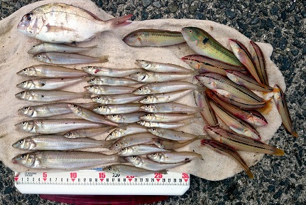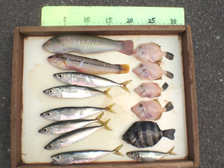 おはようございます。8月28日の日記です。今朝は急な雨で釣行を中止した方も多いのではないでしょうか?本当に最近の天候の急な変化、想像を絶する災害には閉口させられます。最近のトピックスですが地元の釣り師がカワハギ釣りに日参されてます。まだ小さいのが多いけど時折、良型も釣れるから旬の魚の先取りや!と狐針の胴付仕掛けに石ゴカイをつけて竿を出されてます。勿論、小さいのはリリースされる本当の釣り師ですのでご安心を。これから秋が深まるにつれてサイズアップしますので楽しみにしておいてください。昨日の釣果情報です。昨日は一昨日に比べて暑さも厳しく、食いも悪かったみたいです。帰り際にクーラーを見せてもらいましたがアジは20~30匹。キスも10~20匹の人が多かったです。でも、ビギナーの方も多く、この匹数で大満足と帰られたのが救いでした。詳細釣果です。神戸の大学生Iさん。竿、仕掛け一式を購入され、アジ釣りに出かけられました。アジ以外にサンバソウ、サバ、コノシロ、カワハギも釣れて初めての釣りにしては大満足、上出来だと謙虚に仰ってました。スポーツマンらしく、礼儀正しい姿に好感が持てた青年でしたね。続いてキス、ベラの釣果です。防波堤からの落とし込み、チョイ投げでこれだけの釣果です。浅場での釣りだったのでアタリが鮮明で大きかったので嬉しかったと仰ってました。(無理やり、感想を聞いたのですがね)餌は青虫、石ゴカイ。仕掛けは胴付仕掛けを使用されました。キス釣りの楽しみ方は色々ありますね。■アタリを楽しむ■サイズを楽しむ■数を楽しむ■遠投で釣るのを楽しむ■簡単に釣れる楽しみ方は人それぞれですがビギナー、ベテランさんも夢中させてくれる魚ですね。では、今日も良き一日だったと思える日にしてくださいね。