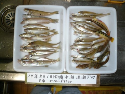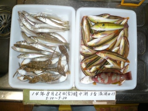 こんにちは。8月24日の日記です。バケツに入れた氷水を頭からかぶる人がSNSを通じて爆発的に広がっているとの報道を見ました。難病の一つであるALS患者の支援運動『アイス・バケツ・チャレンジ』と呼ぶそうですね。1ケ月で募金55億円が集まる一方、ゲーム化に批判も上がり、アメリカ政府、議会では禁止令も出る等ブレーキが掛かる動きもあるとか。私は例え偽善であったとしても、その行動に意味があると思います。今後共、ALSの早い治療薬の開発の為、健全な方向で継続して欲しいと願います。一昨年、愛するALSで亡くなった親しい先輩も心から望んでいる事と信じてやみません。さて釣果情報です。まずは昨日の釣果から。大阪の稲田様親子の釣果です。ベラ20.5cmは見事なサイズです。そして目を引くのはカワハギ。釣れているとの情報はあったのですがこのまま成長してシーズンに入って欲しいですね。餌は石ゴカイ、シラサ。そして本日の釣果は不安定な天気でしたが多種の魚があがりました。寝屋川のHさんはキスを27匹(18.5cmが頭)餌は石ゴカイ。同じくキスの釣果は滋賀のTさん。キス32匹。ベラ1匹ハゼ16匹餌は石ゴカイお二人とも食いは今一だったと仰ってましたがそんな中でも確実に釣果を出されてますね。最後は京都と大阪の『別嬪ガール』です。アジ、サバが合わせて22匹そしてなんと30cmのコノシロが3匹。引きの強さに圧倒されたと仰ってました。女性のやわ腕ですからね。最新は急な天候の変化がありますので予報をみながら雨具は準備していた方がいいかもしれません。明日は10時迄の営業ですので宜しくお願いいたします。