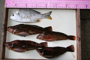 おはようございます。4月19日の日記です入力した日記が消去してしまい、がっくりしながら再入力しています(泣)まあ、記憶力のトレーニングになりますし、焦らずに再入力するとします。昨日は好漁でした。大物もあがりましたし、旬のカレイも小型ながら数があがりましたし、期待が持てる釣果ですね。一昨日の釣果も含め、アップしていきますまずは伊丹の釣りガール足立様マムシと青虫を餌に根魚ゲットです。我家の愛犬と一緒に写真を撮らせて頂きました。続いて大久保の坂口様ご自身の自信のあるポイントに入り、ばっちりキビレとカレイをゲットされました。前回もキビレを2匹、ゲットされてますので好ポイントなのでしょうね。管理人も頂いたキビレを刺身と煮つけで食し、今までの概念が覆えった程の美味だったと話しましたが一つに綺麗な海に生息しているのも要因の一つでしょうね。最後は神戸の永田様須磨一文字から内向きに投入してカレイ6匹、天然真鯛40センチの釣果でした。餌は青虫仕掛けは流線9号でハリスも細めでしたので近隣の人も玉網で無事に上げる事ができたそうです。前回は30センチの真鯛でしたので大幅、サイズアップです。居るんですね、こんな大物が。神秘的ですね。お持込くださった皆様、お疲れの所、ありがとうございました。
