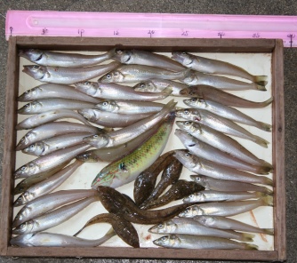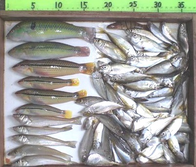 こんにちは。吉川釣具店です8月15日の日記です。釣果情報です。寝屋川の原田さんが今日もキスを持参して下さいました。めだって良型は居ませんが18cm頭に35匹他にはベラ1匹、コチ5匹でした。明日、blue tetristさん個人の企画でキス釣り大会を開催されると耳にしたそうで、参考までにと仰ってました。詳細はhttp://bluetetrist.blog.jp/archives/39131743.htmlをご参照ください。昨日は埼玉から須磨に移転してきた前田さんが先日のアジ釣りに続き、チョイ投げで釣った魚を見せに来てくださいました。アジ、キス、べら、チャリコと引きの違いを味わったのでしょうか。今日も須磨浦漁港、千守突堤でアジが上がっていたそうです。潮とサビキ仕掛けを間違わなければ今のアジは釣れますので。。釣果お持込は須磨のKさんですサビキはスキンの4号をお使いでした。では、又、明日。
