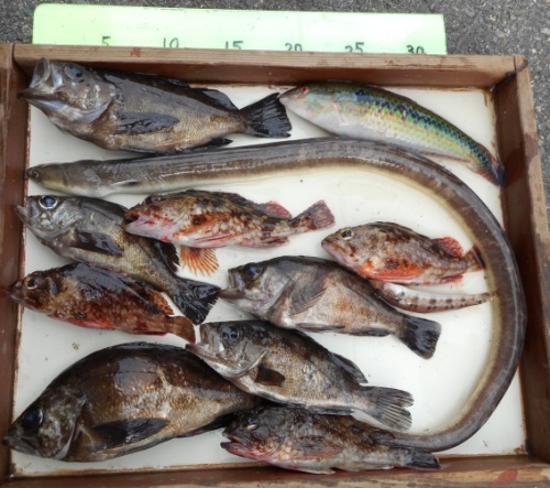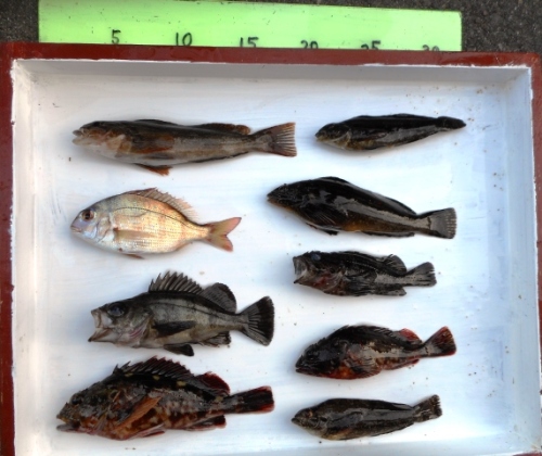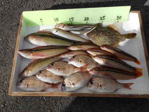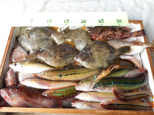 こんにちは。10月7日の日記です。今日から衣替えで長袖シャツに着替え、釣りに出かけてました。須磨一文字へ延竿釣り師のSさんと久しぶりの釣行です。狙いは旬の魚、カワハギでしたが。。。結果、惨敗です。(3匹だけでした)敗因は色々とありますが魚が少ないのが大きな要因だと思います。磯ベラ、スズメダイの餌取りにも悩まされました。本当は私自身の腕かもしれませんがそれは口が裂けても言いません。カワハギがダメであればそこは転んでもただでは起きない二人です。刺身用に青ベラに対象を変更してと言いつつもほぼ同じポイントに居ますし、仕掛けも餌もほぼ同じでアタリを取るかどうかの違いだけなんですけどね。私は30年前に購入した4.8mのヘラ鮒つり用の竿(初期のカーボン)で釣りましたが鮮明なベラのアタリと強烈な引きを十分に堪能してきました。写真は二人分ですがSさんの名誉の為に一言。私がバケツをひっくり返し、自然放流をしてしまったのです(涙)餌はシラサエビ、青虫を使用仕掛けは市販の胴付仕掛け(キツネ3号)そして昨日の釣果です須磨のSさんがベラ40匹大きいのは20cmありました。近隣の防波堤を延竿で探ったそうです。最後はアジの釣果神戸のFさん夕方の釣果ですサビキは4号をお使いでした。アジと共にウルメイワシ、カタクチイワシも回遊してきてますので時間帯によってどちらになるかは賭けです過ごしやすい季節になり、爽やかな潮風に吹かれながらリフレッシュして明日の英気を養いませんか?