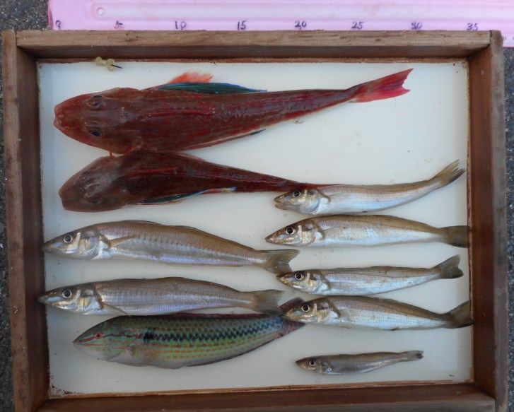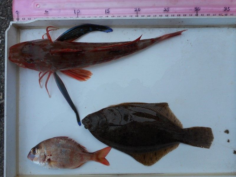 吉川釣具店です12月4日の日記です先週から続いているアジとイワシの乱舞が今日も発生してます。イワシは玉網で掬って捕れる程ですお子様にとっては年に一度あるかないかの出来事で金魚掬いならぬ、イワシ掬いのありさまです。それでは昨日の追加釣果です。寝屋川の原田様がキス狙いでホウボウ(29cm)を頭に2匹。本命のキスは20cmを頭に7匹。青ベラもいます。他にも昨日、ホウボウを釣られた方もおられましたし、一昨日も29cmを釣られた須磨のAさんもおられます。参考までホウボウの名は一説では「方々」歩き回るところから来たと言われているそうです。狙って釣れる魚ではありませんが釣れたら美味で高価な魚だそうですからラッキーですね。今年は海水温も低下まで、まだまだ五目釣りのシーズンは続きそうです。注)明日は月曜日で定休日ですが朝11時迄、営業しております。時間がある方は須磨ならではのカレイ、キス、カワハギ、ベラ、小鯛が待ってます。そうそう、イワシ、アジも今日の雨で活性が上がると思います。本日の釣果は明日、アップします。
