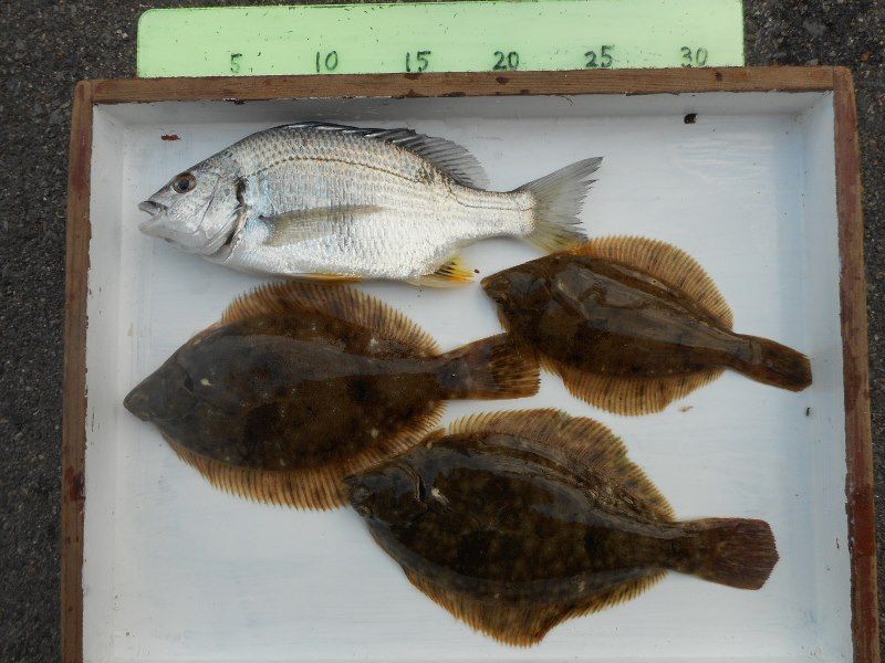 吉川釣具店ですこんばんは。早速、釣果情報をアップします。近隣の須磨防波堤での釣果です。まずは須磨のAさんです『こんなのしか釣れませんでした』とブログ用にお持込くださったのはカレイ21cm3匹、チヌ24cm1匹。当ブログでおなじみになりましたAさん、小さ目と言いつつ4匹はお見事ですよ。いつも釣果をお持込くださり、ありがとうございます。そして宮島様ご夫婦40cmのポン、そして34cmの石ガレイですご主人がポン、奥さんがカレイを釣り上げました。仲良く1匹づつ。何と、お二人とも、自己最高サイズだそうです。お二人揃っての記録達成、本当におめでとうございます。尚、奥さんは姿を見る事も無く、引きの強く重い魚を逃がしたそうです。針が伸されていたとか。。。でも、悔しさも許せる一日だったのではないでしょうか。明日も暖かい一日との予報で、期待が膨らむ須磨海岸です気軽にビッグな獲物を求めてお越しくださいませ。