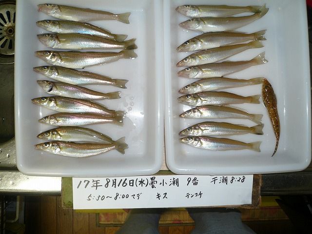 吉川釣具店です8月5日の日記です今日は『みなと神戸花火大会』そして『淀川花火大会』2つ共行きたいけど、一つだけにしておきます。写真は撮らずに心に焼き付けてきます。それでは8月5日、土曜日の釣果です暑い中、先週に続き、遠方からお越しくださったお二人の釣果です滋賀のTさん干潮にもかかわらず波をかぶって散々だったそうです。キスは1匹を除き、延竿での釣果でした。途中でアジ狙いに変えたのでしょうか。寝屋川のHさんは20cmのコチ、20cmのキスを含み、ご覧の釣果。今週は波があったのでキスはどこかに避難しているのですね。そんなでもお二人のこの成果は良しですね!1日の釣果ですが神戸の田中様アジ、サバの釣果です。明日以降は台風の影響を考えて外出してくださいね。