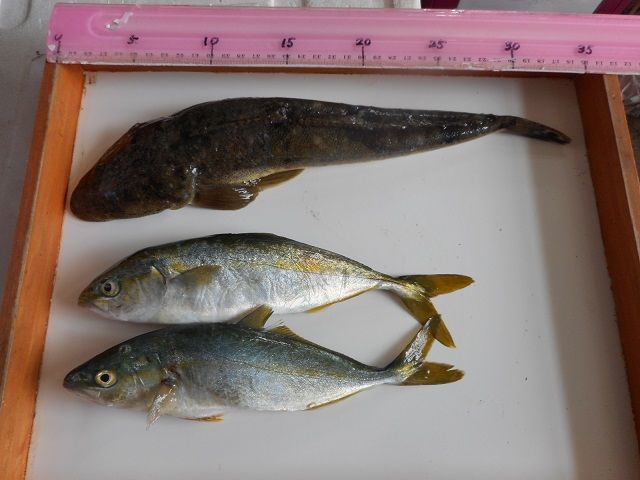 サビキで豆アジ、中アジ、サビキ仕掛けにツバス、チャリコ、グレも掛かってきます。