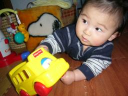 *ハ-フバ-スディまでカウントダウン*(ちょっと大げさですが・・・)・ ずりばい!?して場所移動するようになったよ。・ 右手バシバシたたいて それって こいでいるのかい(家事の合間に今度はどこに移動したか密かに見るのが楽しみだったりして・・・)・ 足をピョンピョンはずませて今日も元気に立ちたがり・ 指をしゃぶるんではなく、指に服のはしをのせておしゃぶり 指だけじゃ嫌みたいで服をチュパチュパしたいみたい・・・ おかげで服はびしょびしょだよ。 ぬれるから袖をめくると怒るし、やはりちょっと風変わり!?・ 用事がない日はなぜかムダに早起き。 朝から出かけるときに限ってお寝坊さん。・ 抱っこしてほんのひとときコ-ヒ-を飲もうもんなら、 何飲んでいるの!?とばかりに私の顔のそばにちっちゃな顔が・・・(ちょっとぉ 顔近すぎて飲めない 邪魔なんですけどぉ) (何気に嫌がらせ!?) 只今 悪巧み中『とったぁ もう これ ぼくのもの』 本日の離乳食プレ-ンヨ-グルト(パクッと食いつくけどブ-ッと出す 前途多難)