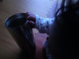 最近とりあえず何でも触ってみたがりです。渡せばなんでも握るんだけど、まさか寝返りであそこまで移動するとは・・・入浴後、おっぱいタイム。おっぱいあげていると喉かわくので、近くに私のコップを置いていた。化粧水をつけたいので、ほんのちょっとだけ目を離したらコップに手をかける小さな悪魔が・・・ぎゃあ~ 待って!慌てて駆け寄ったがほんのタッチの差で半分床にこぼれてしまった。私の大声でパパが素っ裸のままお風呂から出てきた。『どうしたの!? 何事かと思ったよ。』再現です。見た瞬間にはこうなっていたのです。こんなところにおいて置いたママが悪いんだけど、焦りました~もうあなどれませんね。 前はこんなにしっかりしてなかったのに、もうちゃんと握るのよね。