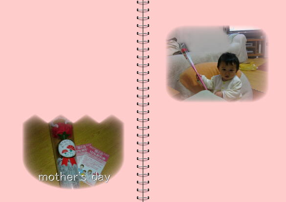 今日は母の日・・・「うちの母親に何か~」 と思っていたら、 ”はじめての母の日じゃん” と言われたよ~なんかあまり実感なかったけど・・・あっ そっか 私もなんだね~今日は、ロイヤルホストでちょっと遅めの昼食。母の日イベントをやっていて、私も貰えるのかなっ!? と思っていたらくじ引きでカ-ネ-ションいただきました~ささやかなプレゼントが嬉しかったなっ・・・改めて実感!!(母の日だからって)旦那が夕飯にパスタを作ってくれたよ。でも旦那の大好きな”K-1”やっていたのでその後はテレビに釘付けだったけどね まぁ でも感謝 感謝!!男の人ってサッカ-とか格闘技大好きですね~ちびが大きくなってプレゼントくれたら嬉しいんだろうなぁ