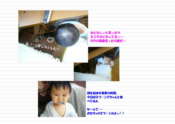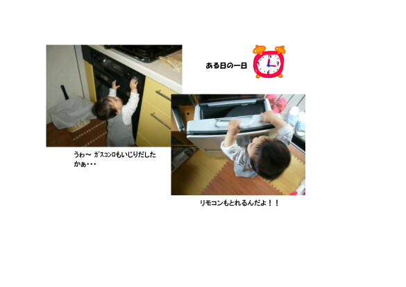 最近、ジ-ッと見て真似ばかり。見ていないところで今のうちに・・・と空気清浄機にスイッチ入れているつもりなんだけどいつの間にかジ~ッと見てます 見てます もぅ奴はあなどれません!!(その後、空気清浄機のモ-ドはいつも最大までパワ-アップするのよねぇ~) カタコトが大好きなちび、今度は乗り物をカタコトにしているよ。ちっちゃぃのにいろいろ考えて~ あるもの何でもおもちゃねぇ!!あれ!? たっくの動きが止まったよ!!注意散漫、あきっぽぃこの男が・・・いつも私の足にすがりついてくるこの男が・・・ちょっと言いすぎかなっ!?以前、姉からもらった”しまじろう”にかなり夢中のご様子。やっぱりこどもチャレンジって効果あるのねぇ!!