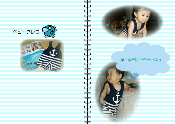 GWも終わっちゃいましたねぇ~今度は夏休みを待ちたいところです 気が早いかなっ!?この間買った育児雑誌で水着特集をやっていたの。早速掲載店、SHIPS KIDSにTELしてみたよ。80cmは人気で品切れらしく、他店から取り寄せてくれるとのこと。「売り切れ御免」って書いてあったからもぅないかと思ったけどよかったよかった!!夏を先取りして着せてみたよ~今年の夏は、旦那が国民宿舎 鵜の岬にちびを連れて海デビュ-しよう!!とか言っていたけど 安くてすごく人気のいい宿みたいで、テレビでも特集されたほどなんです。でも人気なので、なかなか予約が取れない。往復ハガキで申し込んだけど、「厳選なる抽選の結果、残念ながら・・・」という返信ハガキが届いちゃった。はずれたのなら仕方ないねぇ 私はニヤッとしちゃうけど・・・じゃぁ夏どこ行く~沖縄行っちゃいますかぁ~こうなったらジワジワと離島へ向けて計画しちゃいま~す。