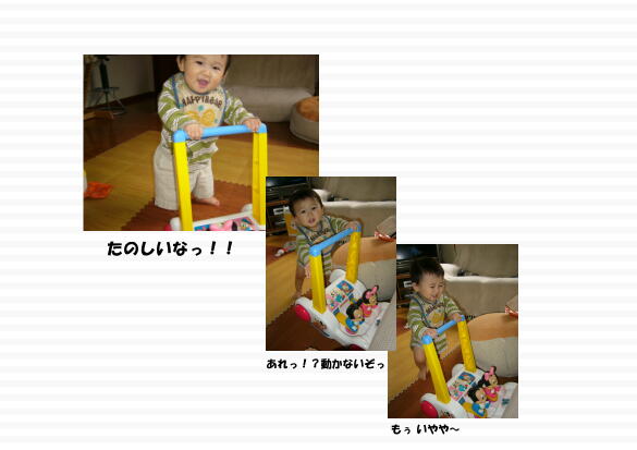 毎週火曜日は、だいたい開店と同時くらいに『ジャスコの火曜市』に行きます。昨日は、買い物行く前に2回も連続うんち。またオムツ替えなきゃだぁうゎ~ 2回目は大量だし (汗;)【早く行かないと卵が売り切れるぅ~】って焦ってたの。ボタンも留めずにジャスコへジャスコのカ-トに乗せようとしたらあれっ!? なんか生尻っぽいぞ!!なんとフルチンでジャスコへGo してました 苦笑関係ないけど、ちなみに前日はダイソ-ではみちん。 (いや~ん 悪いのは全部私。)そんなドジな母だけど、ちびは1人でカタコトしだしたりして遊んでます。最初は笑顔でご機嫌なんだけどさっ行き止まりで身動き取れなくて最後には泣くのよね~ その繰り返し!!ごめんよ 狭い家でさぁ~