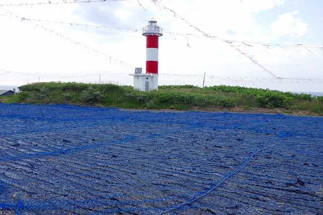 利尻島の南端、仙法志御崎に来ました(P)。赤白の灯台があり、昆布が干してあります。カモメに食べられてしまうのでしょうか?上空にはひらひらが付いた紐が張ってあり昆布には青い網がかけられています。その近くにはカモメが1列に並んでいます(P)。仙法志御崎公園に着きました(P)。夏にはアザラシが来るという仙法志御崎公園ですが、いるのは観光客だけです(2P)。生け簀がありますので私も行ってみましたが、中には何も入っていませんでした(P)。山から流れてきた溶岩が固まったという海岸は他とは違った景観を作っていました(2P)。観光客向けでしょうか、昆布を干してあり2軒の土産店があります(3P)。私もここで土産の昆布を買いました。美味しい昆布を家で食べたり出しを取ったりするのが楽しみです。