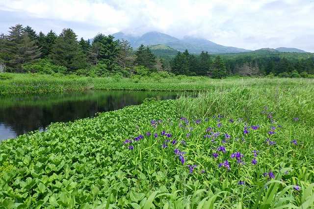「利尻島郷土資料館」に寄った後、県道を走っていると「白い恋人の丘」の表示があり寄ってみました(P)。(ブログに載せた唯一の記念写真です。バイクで走ると風が冷たいのでジャンパーを着てこんな格好で走っています)「白い恋人」、聞いたことがあるような名前だとは思いましたが、まさかあの北海道土産「白い恋人」のパッケージの写真を撮った場所だそうです。もらって食べたことは何回かありますが、写真をよく見たことはなく山が写っているくらいにしか印象がありませんでした。改めて思い出せば、あの山は昨日登った利尻山です。そして今日は山の半分より上は雲の中です(P)。ここの本当の名前は「沼浦展望台」というようです。道路の向こうには利尻島を代表する観光地「オタトマリ沼」があります。行ってみましょう。広い駐車場があり車が10数台停まっています(P)。ここから見る利尻山がよいようですが今日は上部が雲に隠れています(P)。たくさんのキショウブやヒオウギアヤメが咲いていました(2P)。さすが観光地、2軒の店がやっていて焼きホタテを600円で食べることができます(P)。私は昨日の夕食で大きなホタテフライを4つ食べましたので、食べようか迷いましたが食べるのをやめました。さあ、バイクツーリングを続けましょう。