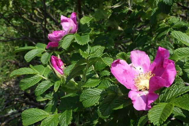 「こうほねの家」ってどういう意味があるのだろう。そう考えながら走って行くと牧場があり牛が草を食べていました(2P)。「こうほね」ってどういう意味?調べるとすぐにわかりました。スイレンの仲間の水草、コウホネです。「こうほねの家」は、コウホネがここの沼に群生していることから付いた名前なんですね。12時少し前、「浜勇知園地(こうほねの家)」に着きました(P)。ハマナスの花々の向こうに利尻山が見えます(P)。いい所です。できれば、どこかで昼食を取りたいと思っていましたが、途中に食堂はないし、残念ながらここ「こうほねの家」も無料の展望休息所で食事は扱ってはいません(P)。階上に上がり展望を楽しみましょう(2P)。お昼時なのに車が3台ではレストランを作っても営業が大変かもしれません。観光地を離れると人にほとんど会わないのが北海道です。車にもあまり出会いません。自然いっぱいのそれが北海道の魅力でもあります。中心の沼を「こうほね沼」と言うんですね(P)。遊歩道を歩いてみましょう(4P)。「サロベツ湿原センター」周辺より風景がいいかもしれません。これはエゾスカシユリですね(P)。近くに咲いているエゾカンゾウとは少し違います(P)。「浜勇知の花ごよみ」があります(P)。6月下旬の今はハマエンドウ、エゾカンゾウ、エゾスカシユリ、ハマナスが咲いているそうです。もっと行ってみましょう、他の花もあるかもしれません(P)。ありました、ハマナスの花です(P)。これはコウゾリナですね(P)。今回のたくさんの『礼文利尻稚内の山旅 6日間』ではたくさんのハマナスを見てきました。ここにもたくさん咲いています。色の濃いエゾスカシユリもあります(P)。7月上旬にはこの沼にホッカイコウホネの黄色の花が咲くのでしょう(P)。ハマエンドウとハマヒルガオがありました(2P)。エゾノシシウドもあります(P)。海岸に行ってみましょう(P)。ムラサキツメグサがありますが、牧草地から紛れ込んだのかもしれません(P)。これはエゾノシシウドとは少し違うのでエゾニュウではないでしょうか(P)。なかなかよかった浜勇知です。まだ時刻は12時を回ったところです。ついでにこの先の「ノシャップ岬」まで足を伸ばしましょうか。