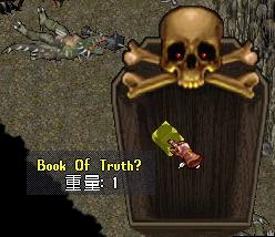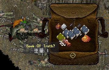 え~現在、リアル日記でパチスロネタ進行中ですが、ちと、そちらはいったん置いておきまして、久々にUOネタをば!!(^^リアル日記最新更新はこちら↓うふっ♪ボーナス確定よっ♪黒岩先生の講義も終了し、寂しいような、呪縛から逃れられほっとしたような微妙な感覚の中、どうやら、新クエストと、新アイテムが追加された模様!!これは、GETしなければって事で、早速、情報収集・・・新アイテムとは「真実の書」と言うもので、新クエストが、その「真実の書」を集めた数に応じていろいろ、もらえるそうですね(^^クエスト主は4人で、それぞれ違うアイテムを持っている模様。で、誰か一人の依頼を受けていると、その依頼を終わらせるか、キャンセルしないと、他の人からは、クエストを受けられない・・・ってことで、誰からもクエストを受けない状態で、とりあえず、「真実の書」を、集められるだけ集めてみようと旅立ったのです!!「真実の書」を持つモンスは、トラメルのダンジョンに沸くモンスなら、どいつでも、持っている可能性があるが、フェイム値が高いモンスのほうが、確立は高いそうです。でも、おいら、そんな強い相手は、怖くて、相手できないのでwとりあえず、デスパイスの通称「うっしゃあ君」(リザードマン)を片っ端から、懲らしめることにしたのです!!(^^;「うっしゃあ君」フェイム値そんなに高くないから、GETなるか微妙!!って思っていたのですが、シバキ初めて10分ほど、2~30匹「うっしゃあ君」倒したところで、聞きなれない笛の音が・・・なにかな?と思いつつ、その時点で、最後に倒した「うっしゃあ君」の死体を開けてみると、なんとソコには!!ありましたよ!!ありました!!「真実の書」!!「うっしゃあ君」からも出るんですね!!(^^vその後、結果として、小一時間プレイしてみて、(皮はがない、死体開くのは笛なったときだけ、 一箇所で沸き待ちせず積極的にうっしゃあ君を追い求める、といったペースで)結局3冊だけGETできました(^^もう少し強いモンスでがんばってみようかな??(^^;