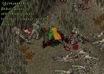 オイラが始めて、ブリタニアの世界に、自分の分身を生み出したのは、6年ほど前のこと・・・ちょうど、トラメルという安全?なファセットが出来て、まもなくのことだった・・・トラメルが出来ると同時に、始めたばかりのプレイヤー専用のヘイブンという、小さな島が出来た。出来たというか、フェルッカで言う「オクロー」という島を、トラメルでは、初心者専用の島「ヘイブン」として、ベテランプレイヤー立ち入り禁止地帯にしていたのだった。そして、オイラも、「ヘイブン」の地に降り立った。当時、「ヘイブン」には、モンバットと、リザードマンという、2種類のモンスターが沸いていた・・・初心者は、その他の、攻撃的でない小動物(うさぎとか)を攻撃して、各種スキルを上げ、その後、モンバット→リザードマンといった流れだった・・・UOを薦めてくれた人と、話をしていると、リザードマン(以後「うっしゃあ君」と呼びますw)は、モンスターの中でも、弱いほうの部類とのこと・・・広いブリタニア大陸や、ダンジョン内には、もっともっと、強いモンスターが沸いているよ・・・と・・・そのとき、おいらの中に、一つの目標が出来た・・・とりあえずの目標!!「うっしゃあ君」を、誰の助けも借りずに、自分ひとりでやっつける!!「ヘイブン」で知り合った、何人かの友達の間でも、それが、最初の目標になった・・・何回も、殺され、もうちょっとというところで、モンバット(当時、こうもり猿と呼んでいたw)に邪魔され、なかなか、やっつけることが出来なかった・・・(当時は「ヤング」キャラでも、モンスから、攻撃受けました><)(今は、「ヤング」キャラなら、自分から攻撃しなければ大丈夫です)仲間内で最初に、その目標を成し遂げたのは、この前、オイラに「砦」をくれて引退したG氏だった!!「手ださないで、ちょっと見てて!!(^^」時間はかかったが、一人で「うっしゃあ君」を倒すところをじっくり、見させていただきました。そのとき、初めて、ヒット&アウェイという戦法を、知ったおいらであった(^^;当時G氏が愛用していた武器が「ハルバード」だった・・・一気に、「ハルバード」に魅せられていくオイラ・・・wその後、盾持ちSS戦士から、斧戦士へとスキル構成を変更するwそして、「ハルバード」が、斧のあつかいではないと知るまでにその後、約一年かかったw・・・( ̄ー ̄)ふっそんなこんなで、最初の目標を、「うっしゃあ君」にしていた、当時のオイラから見れば、今のこの状態は、信じられないような状態なのかもしれないです・・・めざせ「うっしゃあ君」1000匹斬り!!wというわけで、本日は1時間半がんばって、「真実の本?」7冊GET!!今日は、いいカンジで、GETできました(^-^)v (オイラの体感で、Tデスパ「うっしゃあ君」で1時間2~3冊)現在41冊!!目標達成まで、後、9冊です!!(><