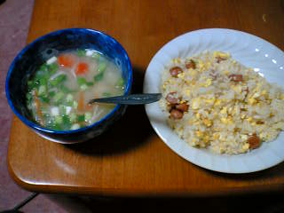 焼き飯と、残り物の味噌汁だす(^^;青ねぎ投入によって、彩が鮮やかに!!(^^;日記も、手抜きか!?ヾ(;´▽`A``アセアセ