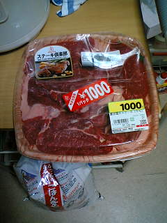 今日、オイラは、再び、昨日行ったスーパーに足を運びました!!「旭ポンズ」とりあえず、一本買ったけど、予備にもう一本ほしいなぁ~と・・・しかし!!あまかった!!(><今日行ったら、きれ~~いに、売り切れてました!!(T_T「旭ポンズ」の置かれていたコーナーは何も無くなり、他の商品すら置かれていない状態・・・つまり、たった今、売り切れた模様・・・(o;TωT)o”あうあう仕方ないので、精肉・鮮魚コーナーへ・・・そんな自分を慰めるため(謎ステーキ肉購入!!4切れ1000円です。グラム数書いてないから、高いのか安いのか・・・(^^;とりあえず、隣においてあった、700gの切り身と天秤してみたら若干、こちらのステーキ肉のほうが重い模様・・・(だんだん、主婦化している・・・(^^;)あ、そうそう、昨日買ったハマグリ500gは、バター焼きにしていただきました(^^500gって、多そうやけど、貝殻があるからねぇ~wおいしくいただきました(^~^)白菜の胡麻和え、トン汁(具材沈んで見えないけどw)と一緒に。ん~色合いが淡白だ・・・ヾ(;´▽`A``アセアセ