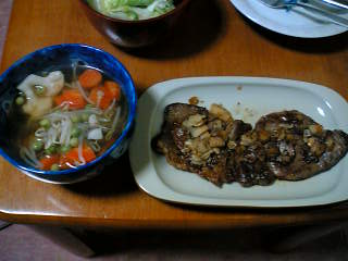 久々に、UPするけど、むっちゃ、写真写り悪いんよねぇ・・・(^^;こりゃ、誰かさんにゲテモノ呼ばわりされてもしゃ~ないか・・・。。・゚・(ノД`)・゚・。 ウエーン 温野菜のコンソメスープと、レタスのサラダ。焦げてるように見えますが、ソースの色がそうなっただけっす(^^;にんにくたっぷりのバターしょうゆ風味でございます・・・ヾ(;´▽`A``アセアセ