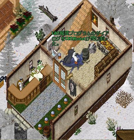 この前の日記の続きを書かせていただきます。この前の日記はこちら↓UO:悲しい別れ・・・(前編)数日後、G氏から、メールが届きました。「二人とも、まさやにだったらいいよ♪って言ってたから、 砦、引き取ってくれ~!!」とのこと・・・「ありがとうです~(^^ 大事に使わせてもらいます!!」と、返事を送らせてもらいました・・・一応、ICQの番号も記載して、送ったんですけど、そこから、しばらく、メールも、ICQも、こない・・・(><で、年も明けたので、ためしに、砦の中に設置した、掲示板のほうにも、カキコしてみました。すると、2.3日後に、Qに置きメッセが、入っていました。(メール届いて無かったんかな・・・(^^;)で、午後八時くらいにICQ上げた状態で、ボケ~っとしてますと、メッセージが入りました!!しばらく、Qのやり取りしつつ、UOにログインしますと、我が家の前に、G氏がすでに、到着していました。んで、とりあえず、これ!!といって渡されたのが、謎の小箱!!中には、10万Gの小切手が、1.2.3・・・16枚!!すげい!!一気に160万Gも、手に入れちゃった!!・・・・・・ちがうわ!!一枚100万Gや!!(^^;い・・・いっせんろっぴゃくまんごぉるどぉ??ヽ(´∞`)ノ アウアウ?(゜▽゜;)(゜o゜)カキーン再び、固まるオイラ・・・その後再起動を余儀なくされる・・・(嘘おいら、狩でやっとこさ貯めたのが、せいぜい100万G。で、色々、取引したり何やかんやして、狩以外で貯めた最高が300万Gくらいです・・・こげな大金見だごだぁねえべさ・・・(^^;(どこ出身やねん!!w)そして、例の砦へと移動いたします!!そして、砦をいただくことになりました!!その後、着ている装備をどんどん脱ぎだすG氏・・・これもやる!!って、くれるのは良いんですが、ここは、北極(デシート島?)です!!見ているだけで、寒そうです。{{{{(+_+)}}}} その後も、どんどんキャラチェンジして、装備を、脱ぎだしますwそして、写真取り忘れましたが、メアやホワイトウィルム、ヒリュウまで、いただきました・・・もう、完全引退に向かって、ひたすら突っ走っているカンジでした。(T_T)ウルウルそして、最後に、長期褒章五年ものの未選択が7つほどあるから、選べ!!とのこと・・・んで、自分の銅像建てられるやつとか、AR+2になるマントと、ローブその他色々、もらいました・・・おいら、一夜にして、一気に、資産家の仲間入りした感じです(謎プレイヤーが建てられる建物の中で、二番目に大きい建物です。(もう一回り大きい建物で、キャッスル(城)というのがあります)G氏には使い勝手悪いから、土台に立て変えてもいいよ。と、言われましたが、もったいないので、このまま使わせてもらいます。だって、もう、建てられないですもんね。砦って・・・(システム的に土地があれば、建てられますが・・・)でも、大きな建物に住んでても、友達みんな引退しちゃったから、ちと、さびしい、オイラでした・・・(>_<)3日がかりで、セキュア整理しました・・・(^^;大半は、リサイクルに回しましたが・・・ヾ(;´▽`A``アセアセそして、翌日、また、Qに置きメッセージが・・・「アカウント停止したから、フレンド登録抹消していいよ(^^」ヾ(@† ▽ †@)ノうわーん さようなら!!G氏!!そして、ありがとう!!(><