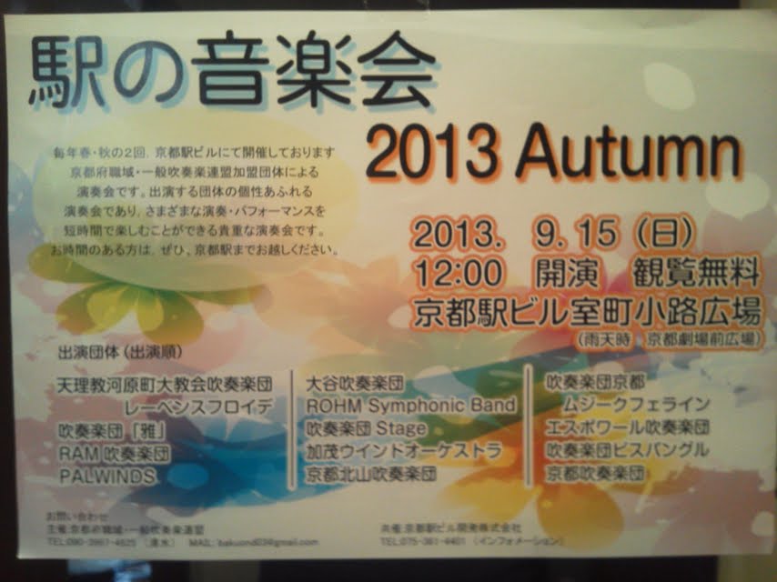 宣伝です。来る9/15(日)京都駅ビル大階段(室町小路広場)にて京都吹奏楽連盟主催の「駅の音楽会2013Autumn」に出演します。日時 2013.9.15(日)12:00開演 無料場所 京都駅ビル室町小路広場(雨天時 京都劇場前広場)全13団体が出演して、京都吹奏楽団はトリ(PM4時頃です)是非聴きに来て下さい。