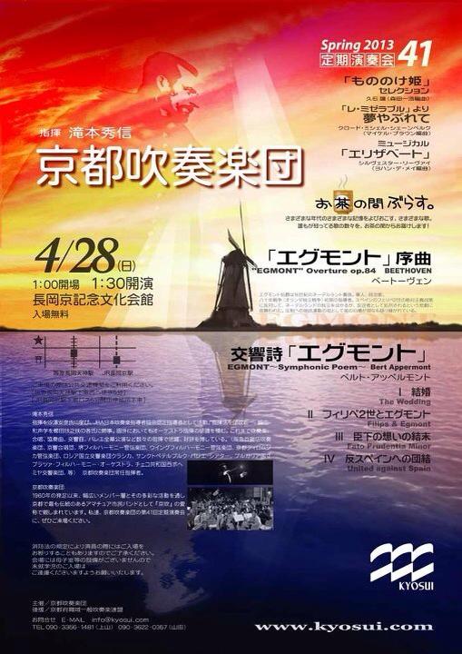 本番まであと4日!!京都吹奏楽団 第41回定期演奏会●日時2013年4月28日(日) 開場13時00分/開演13時30分 入場無料●場所京都府長岡京記念文化会館 【JR】「長岡京」駅下車後、西口よりバスで7分 (「開田」、もしくは「文化センター前」バス停下車) 【阪急】「長岡天神」駅下車後、西へ徒歩6分●プログラム〈第1部〉 ミュージカル「エリザベート」/ヨハン・デ・メイ編曲 「レ・ミゼラブル」より 夢やぶれて/マイケル・ブラウン編曲〈第2部〉 『お茶の間ぶらす。』〈第3部〉 エグモント序曲/ベートーヴェン 交響詩エグモント/ベルト・アッペルモント頑張って練習してます。予定のない方は是非聴きに来て下さい。