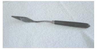これは ペインティングナイフですが、今日はこいつで ペタペタと塗っている。広い面積を塗っていると 左官屋さんになった気分でおもしろい。左官屋さんて あこがれの職業ですよね~~。だけど「塗りムラの壁」という仕事ぶりなので もし左官屋さんの親方に見せたら 叱られそうだ。ところで「もっと大型のナイフで塗るべきかなー??」と うすうす思う。たとえて言うと プリンを 耳かきで食べてるようなちまちま感がある。大きいの持ってないんだから しょうがないか。今日は なんとかして黒の下塗りから徐々に青磁色にしたいなあ。派遣サンのピノコは本日 「青磁色の画面つくり」という業務をしている。