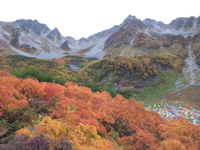 涸沢カールに行ってきました。見えてる山は穂高連山です。紅葉シーズンの3連休なのでメチャ混みでした。山小屋の中は人人人のギューギュー詰めで、ブッたまげました。3日間の山歩きを通して足の方は大丈夫だった。トレーニングの成果アリっ!涸沢ヒュッテに宿泊した夜中に雨が降って、山の上の方は初雪になった。翌朝は紅葉と山の雪という紅白が見れてラッキーでした。あこがれの涸沢カールに行かれてよかっぱよかっぱ。涸沢カールのあたりは"山岳の聖地”みたいな雰囲気がした。山好きな人が集まってるんだねー。