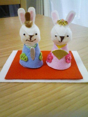 今日は祝日ですが、だんなさまは出勤しています。この頃忙しいみたい。帰りも遅いうえに、今週の土曜日も、休日出勤するらしい。肺炎が治ったばかりだから、あんまり無理しないでほしいな~。健康が一番だからねで、今日は一人のゆったりとした時間を過ごしております。もうすぐ、桃の節句。おひな様。そういえば、我が家の天使ちゃんには、女の子なのにお雛様がないな~って、先日から思っていました。昨日トーカイで、かわいい「うさぎの雛人形キッド」を購入!昨日の夜から二日がかりで、かわいい小さなお雛様飾りが出来上がりました何かこまごまとしたものを作るのは、わりと好きなのですが、なかなか上手にできないんですよね~。糸の始末とか、難しくって・・・でも、心をこめて、大切に作ったんだよ~。天使ちゃん、喜んでくれるといいな~。3月まで、天使ちゃんのコーナーに飾っておきます。ちょっと明るくなって、私も嬉しいです・・・・・さて、最近ブログを書くときに、「テーマで書く」っていうのがあることに気付き(今頃・・・笑)、「赤ちゃんが欲しい」とか「主婦のつぶやき」とかで書かせていただいております。でも、私の生活に(思いに)欠かせない「天使ちゃんへの思い」を書けるようなテーマがなくて・・・。で、勝手に作っちゃいました。「天使ママさん お話しましょう」っていうテーマです。今のところ、このテーマで書いているのは私一人です・・・。(私も今日で2回目・・・)よろしくお願いしま~す(照れ)もちろん、天使ママじゃない方も、のぞいて、アンド コメントお待ちしていま~す・・・・・午前中、ごちゃごちゃしていたクローゼットの中を整理していました。なんと、1年以上ず~っと探していた(最近では探していたことすら忘れていた)ものを見つけることができました。それは任天堂DSの、充電器!本体があるのに、充電器行方不明で、使えずにいたんですよね~そういえば。たまには整理整頓してみるものですね!↑応援ぽち お願いします