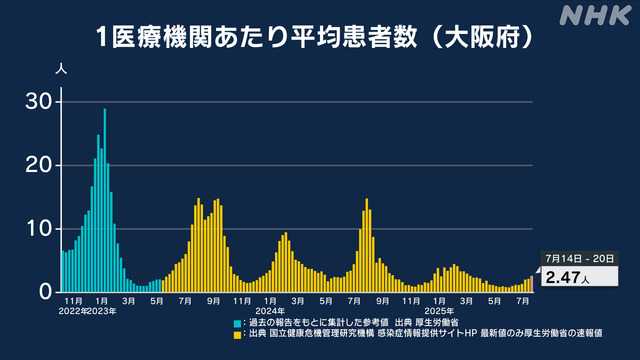 (本日更新2)<新型コロナ情報(厚労省から毎週金曜日(7/25)発表の最新情報)>地元大阪府で、先週1週間(7月14日〜7月20日)に報告された新型コロナウイルスの定点医療機関あたりの患者数は、全国的にも増加傾向が顕著になってきました。(大阪府平均2.02→2.47人、全国平均2.40→3.13人)外出の際は安心せず、状況に応じて必要な感染予防対策の実施が必要です!!地元大阪府の1医療機関あたり平均患者数(NHKのサイトから抜粋)全国平均(NHKのサイトから抜粋)