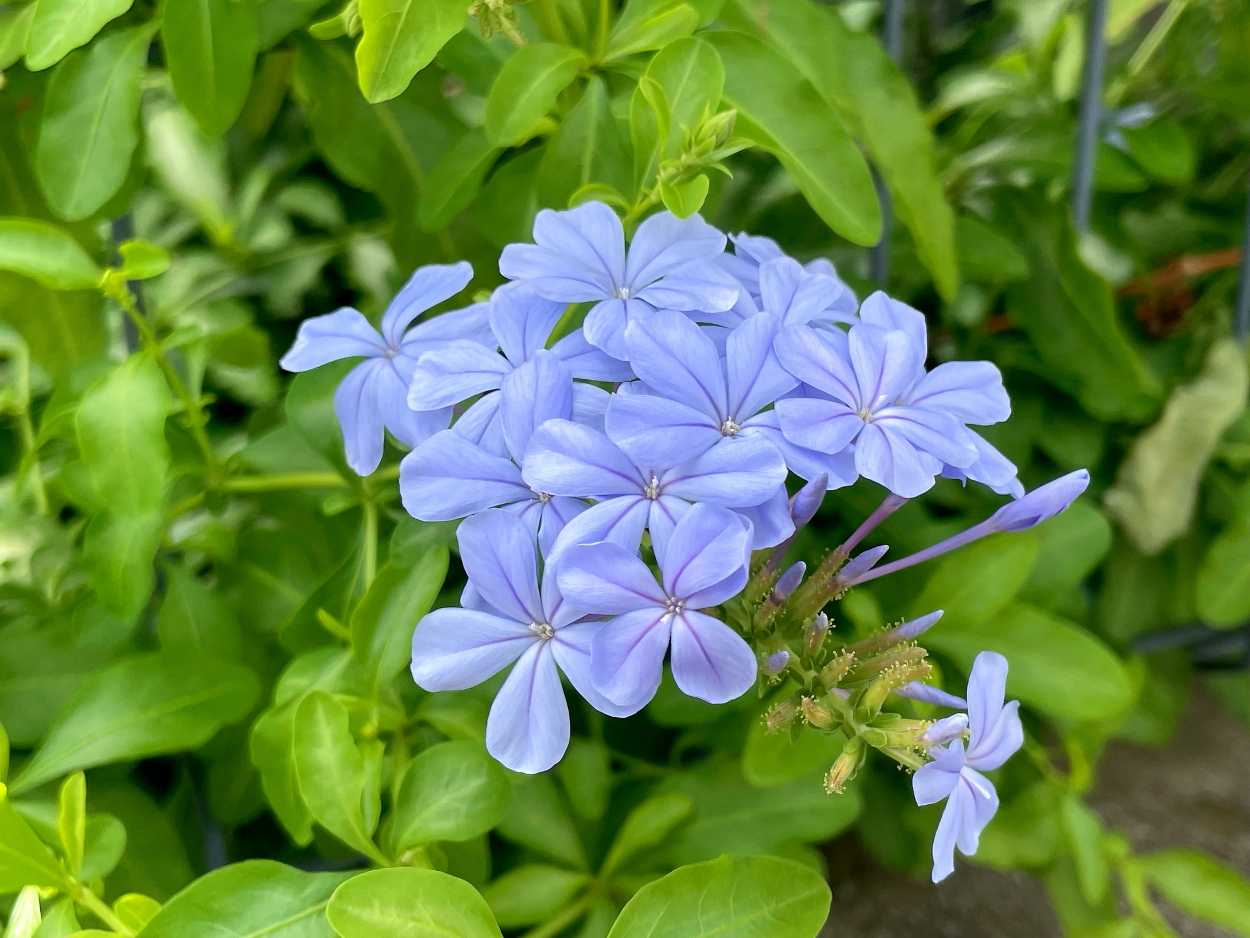 (本日更新1)近所の道路沿いで、猛暑が続く中でも「ルリマツリ」が元気よく咲いていました(^-^)ルリマツリは、南アフリカ共和国が原産で、名前の「ルリ」は花色から「マツリ」は花姿がマツリカ(ジャスミン)に似ているところから名付けられました。花期は6~10月で、花言葉は「密かな情熱」「明るい心」「同情」「ひそかな情熱」などのようです^^※iphone 12 で撮影(ふうさん)☆近所の道路沿いで猛暑の中でも元気に咲いている「ルリマツリ」 【ルリマツリ(瑠璃茉莉):イソマツ科ルリマツリ属の蔓性低木】ルリマツリ(1)IMG_0600 by ふうさんルリマツリ(2)IMG_0598 by ふうさん