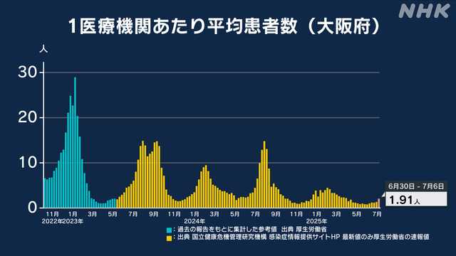 (本日更新2)<新型コロナ情報(厚労省から毎週金曜日(7/11)発表の最新情報)>地元大阪府で、先週1週間(6月30日〜7月6日)に報告された新型コロナウイルスの定点医療機関あたりの患者数は、全国的にも増加傾向に転じてきました。(大阪府平均1.22→1.91人、全国平均1.40→1.97人)外出の際は安心せず、状況に応じて必要な感染予防対策の実施を!!地元大阪府の1医療機関あたり平均患者数(NHKのサイトから抜粋)全国平均(NHKのサイトから抜粋)