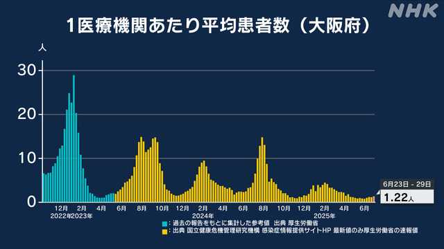 (本日更新3)<新型コロナ情報(厚労省から毎週金曜日(7/4)発表の最新情報)>地元大阪府で、先週1週間(6月23日〜6月29日)に報告された新型コロナウイルスの定点医療機関あたりの患者数は、低水準ですが、若干増加傾向になってきました。(大阪府平均1.04→1.22人、全国平均1.00→1.40人)外出の際は安心せず、状況に応じて必要な感染予防対策の実施を!!地元大阪府の1医療機関あたり平均患者数(NHKのサイトから抜粋)全国平均(NHKのサイトから抜粋)