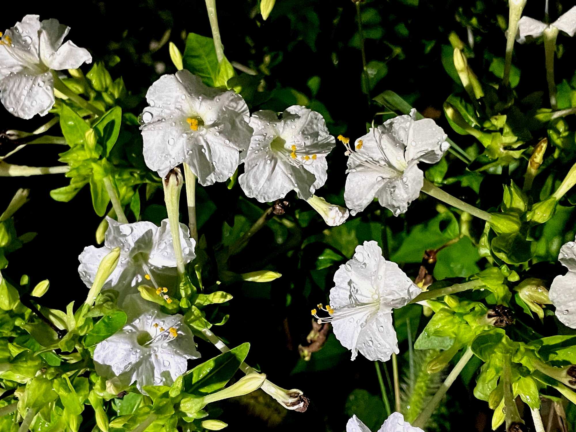 (本日更新1)午後に夕立があり涼しくなったので、その夜にふうさんとカラスウリの花を探して歩いていると、近所の農園で白い「オシロイバナ」が、雨に濡れながら咲いていたので、ライトアップしながら撮影しました(^-^)