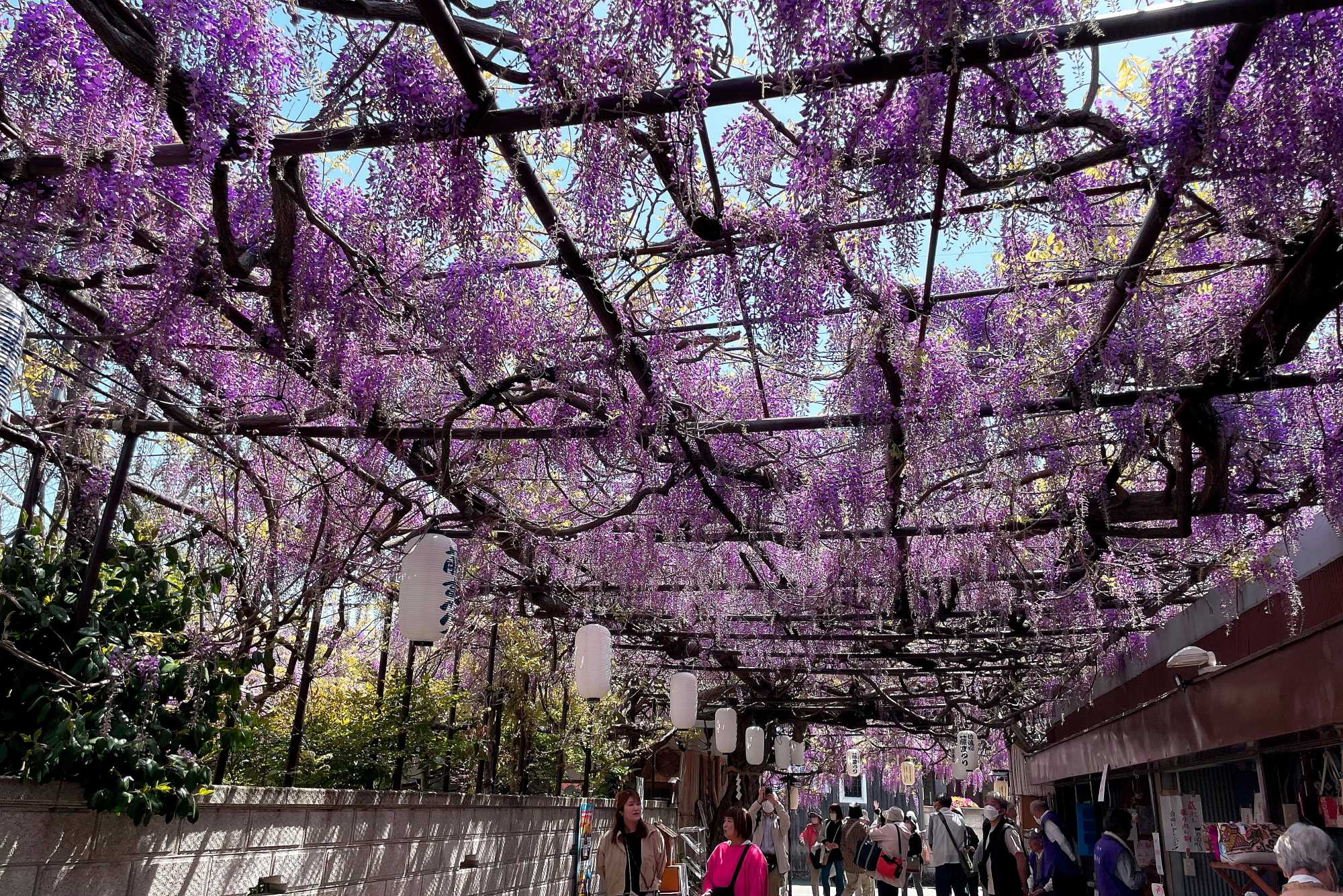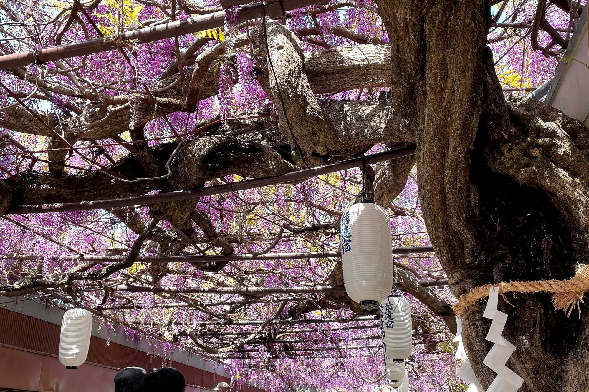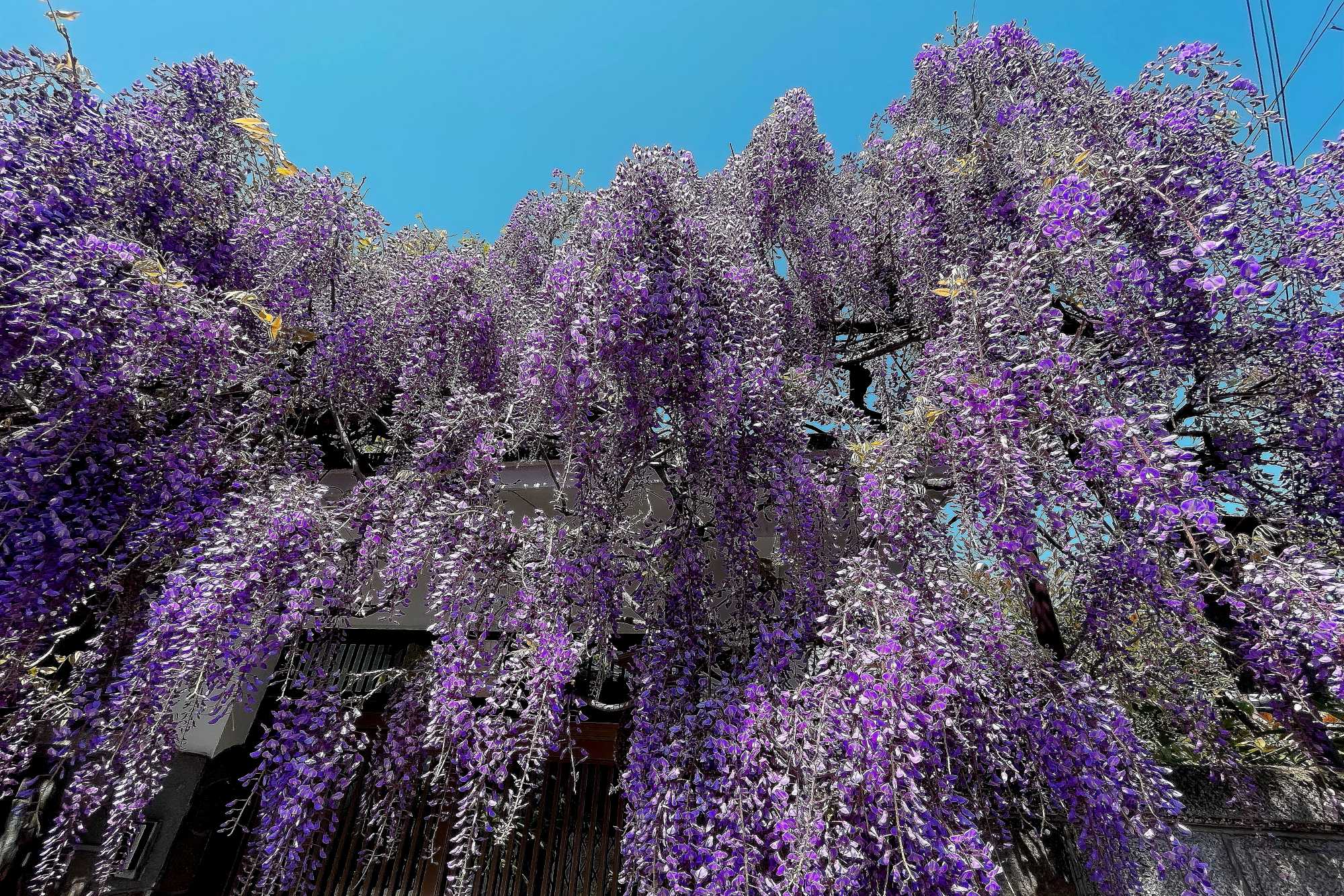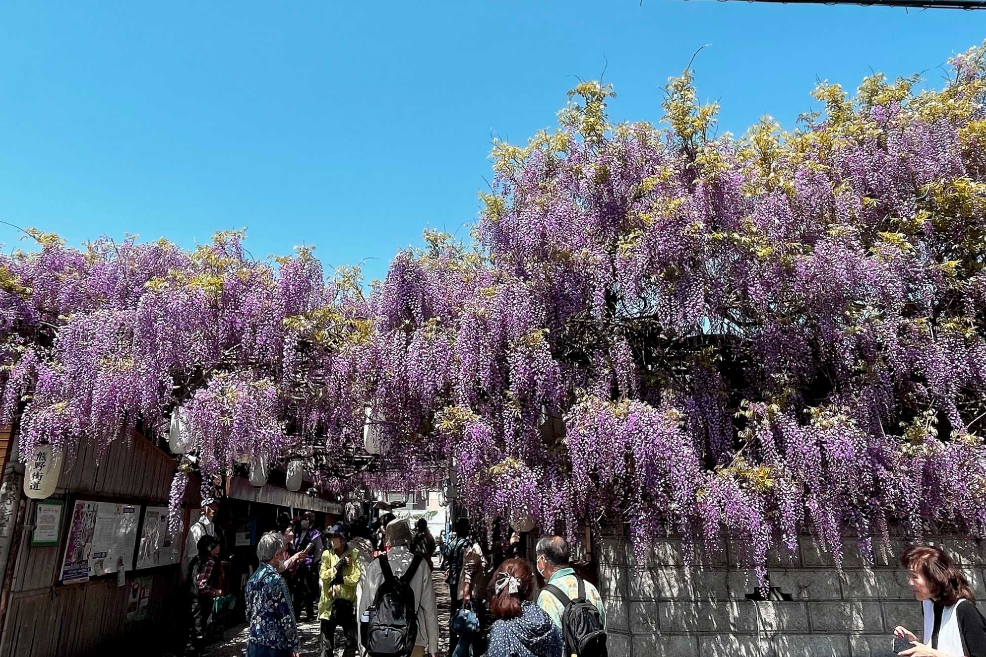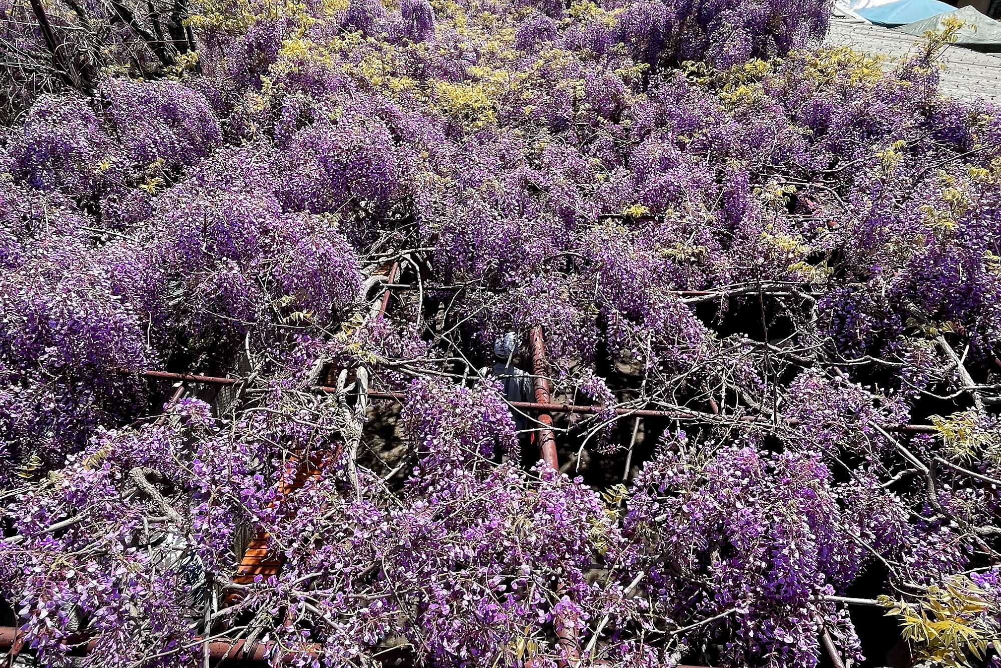 この野田ふじは、民家に育った1本の野田藤が幅30m、奥行き27mにまで広がり、約4万を超す花房をつける様子は大変見事で、保存会の皆さんが頑張っておられました。