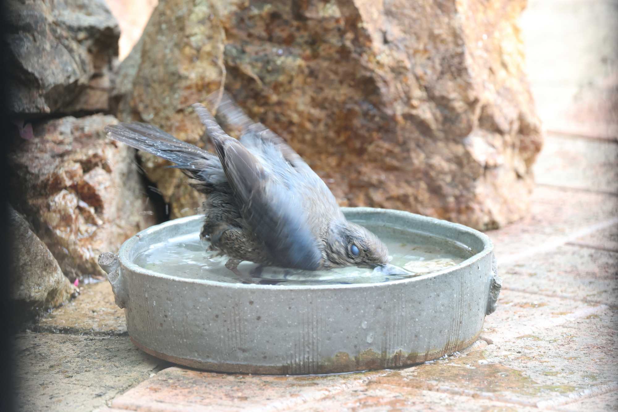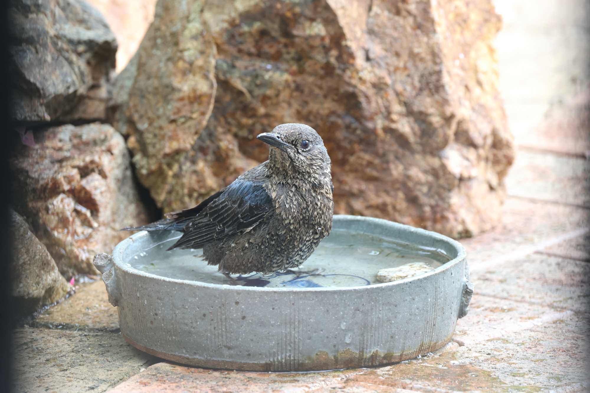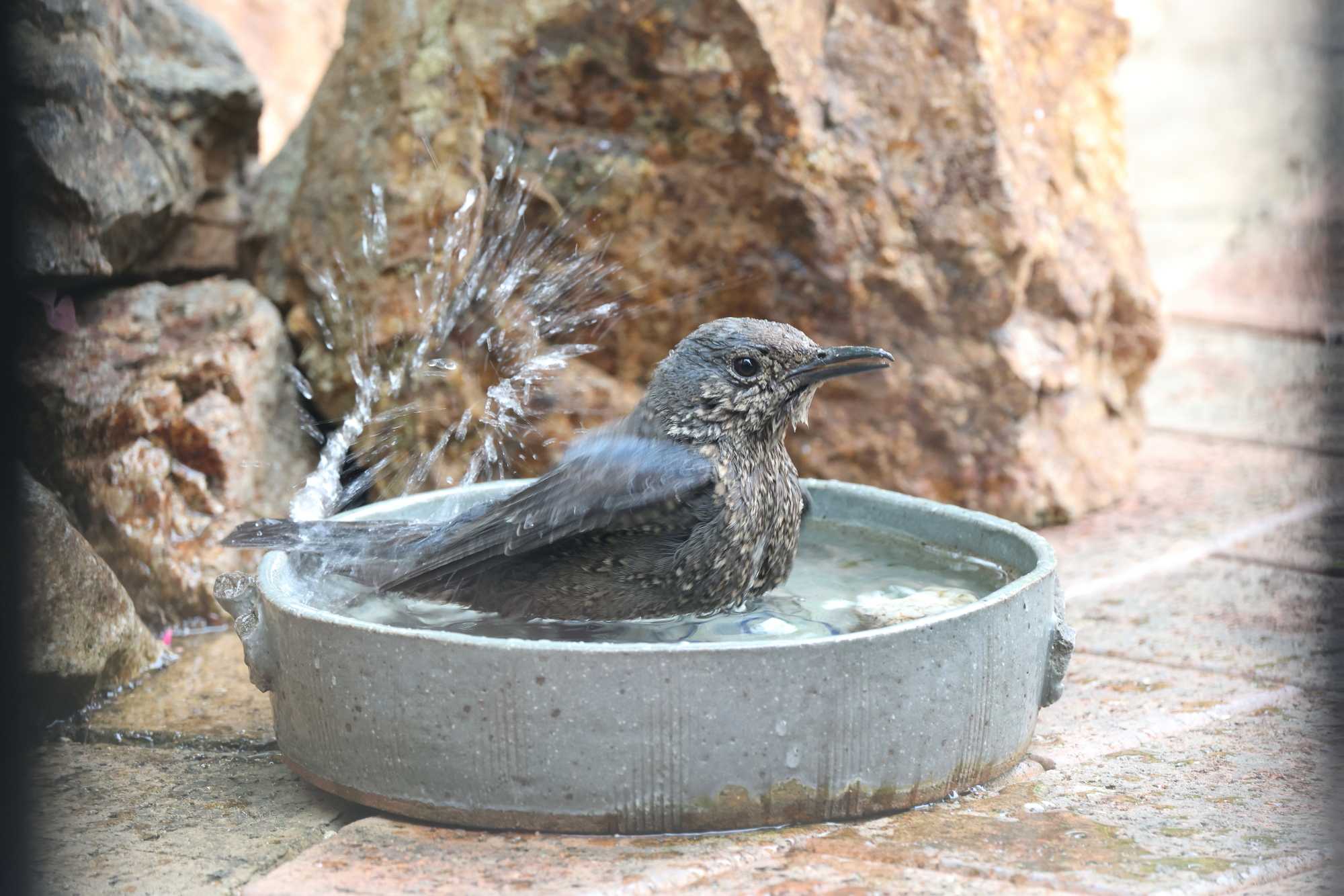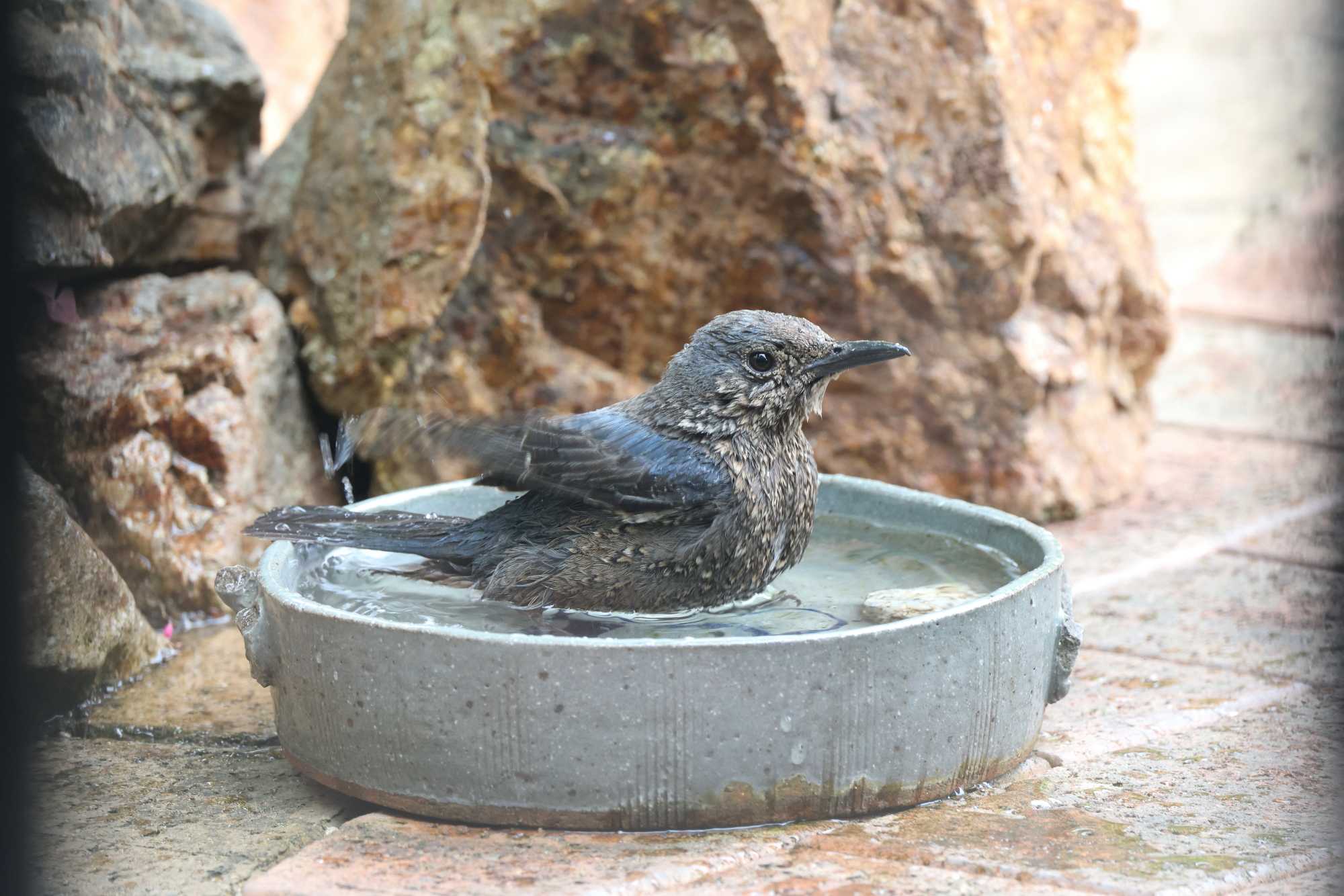 ☆お庭で子育て中に水浴びをする「イソヒヨドリ♀」 【イソヒヨドリ(磯鵯):スズメ目ヒタキ科 TL 23cm 】 <英名:Blue Rock Thrush> イソヒヨドリ♀水浴び(1)058A4955